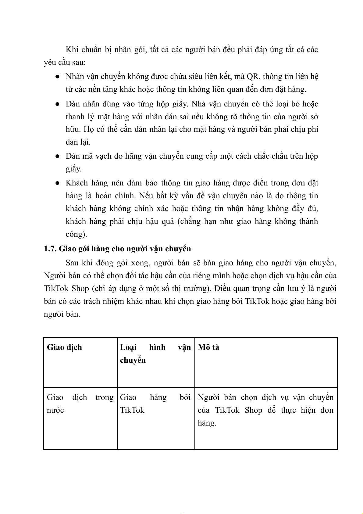 bán có các trách nhiệm khác nhau khi chọn giao hàng bởi TikTok hoặc giao hàng bởi người bán. Giao dịch Loại hình vận Mô tả chuyển Giao dịch trong Giao hàng