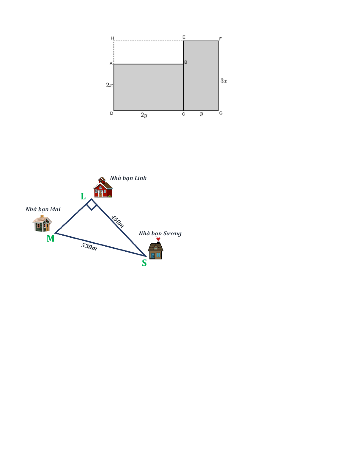 Mai, nhà bạn Linh là 3 đỉnh của một tam giác vuông (như hình vẽ). Hãy tính khoảng cách từ nhà bạn Mai đến nhà bạn Linh?