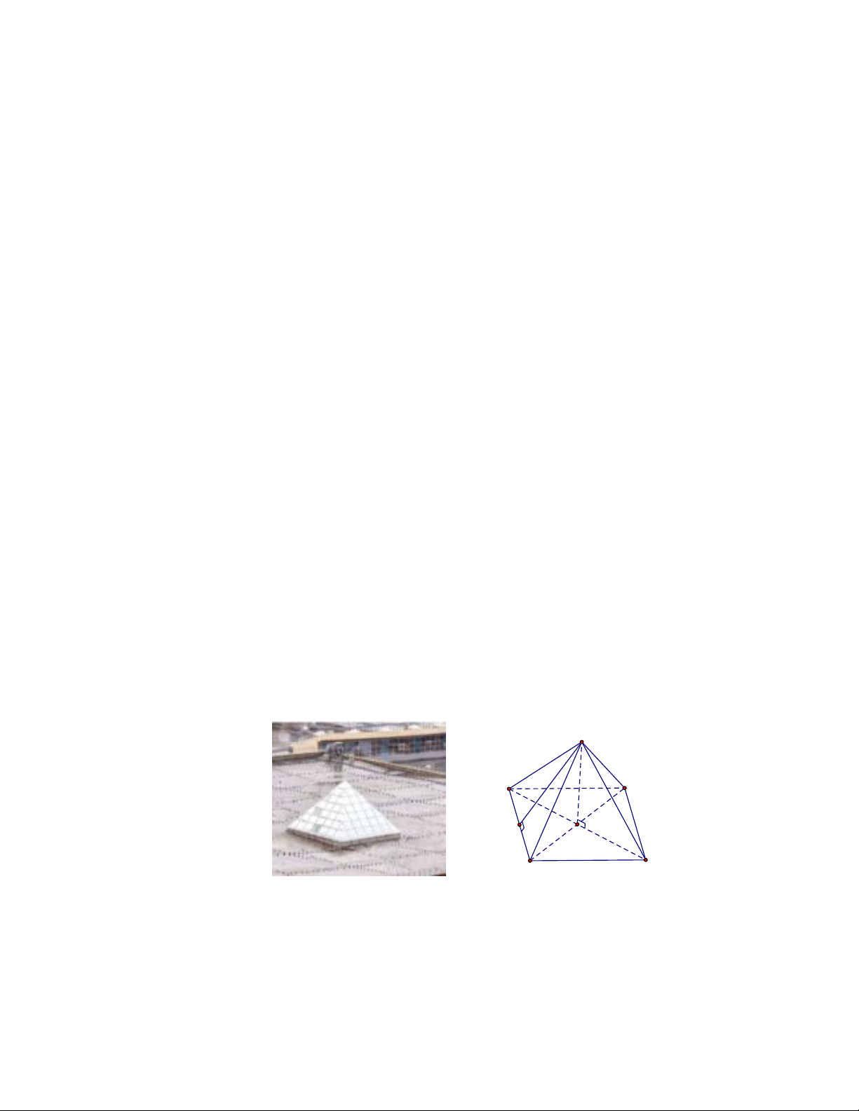 tứ giác đều (hình vẽ), cạnh của mặt đáy dài 6m, chiều cao của mặt