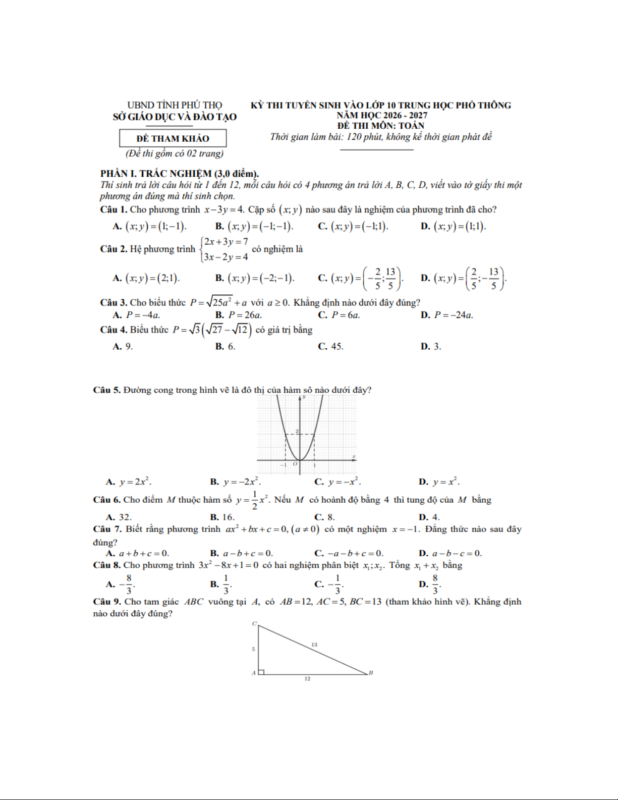 Đề tham khảo thi vào 10 môn Toán năm 2026-2027 – Tỉnh Phú Thọ