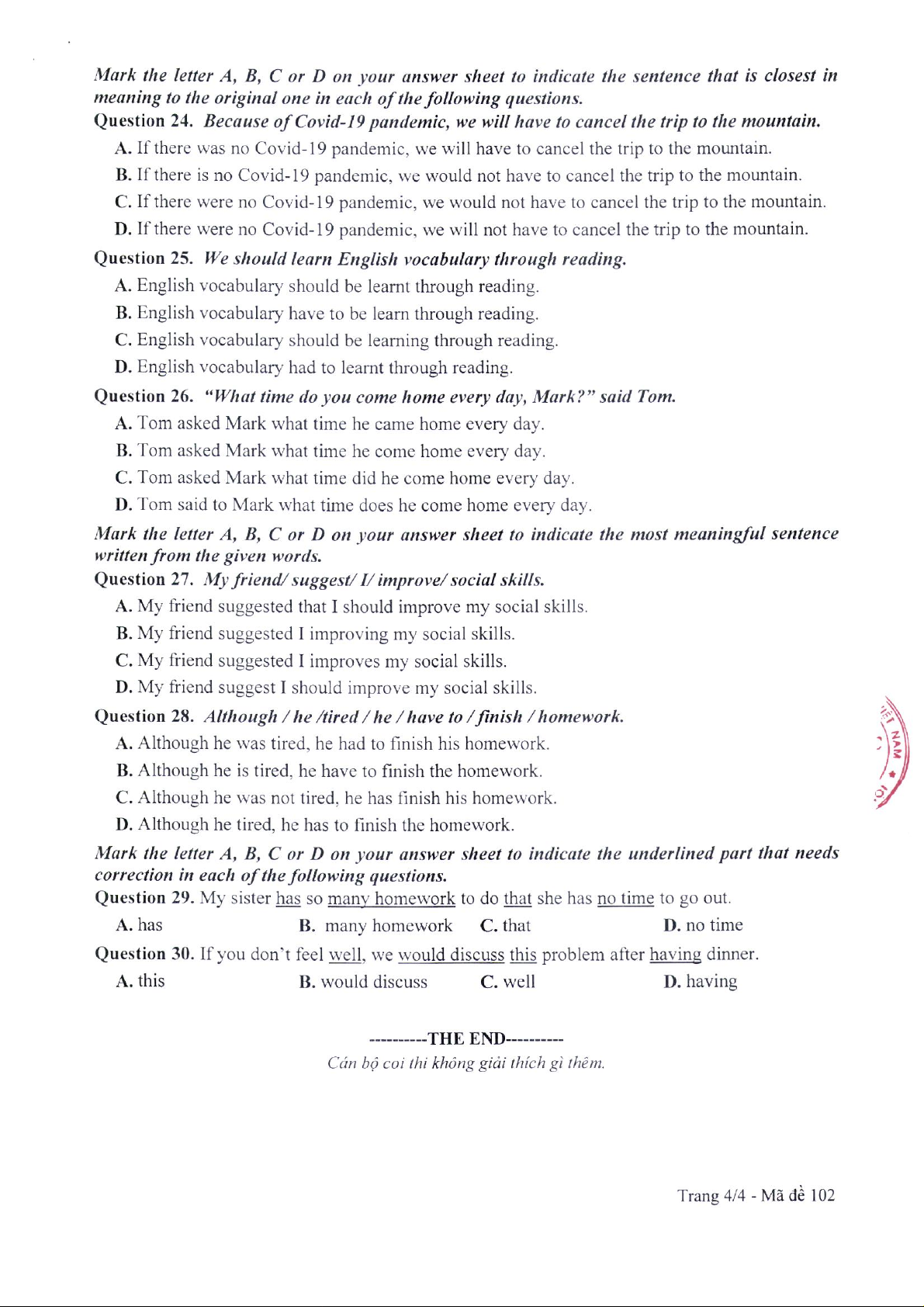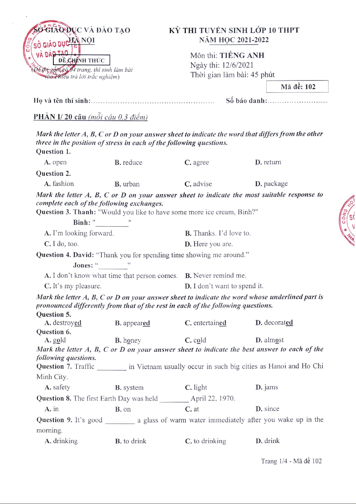 Đề thi chính thức | Tiếng Anh 10