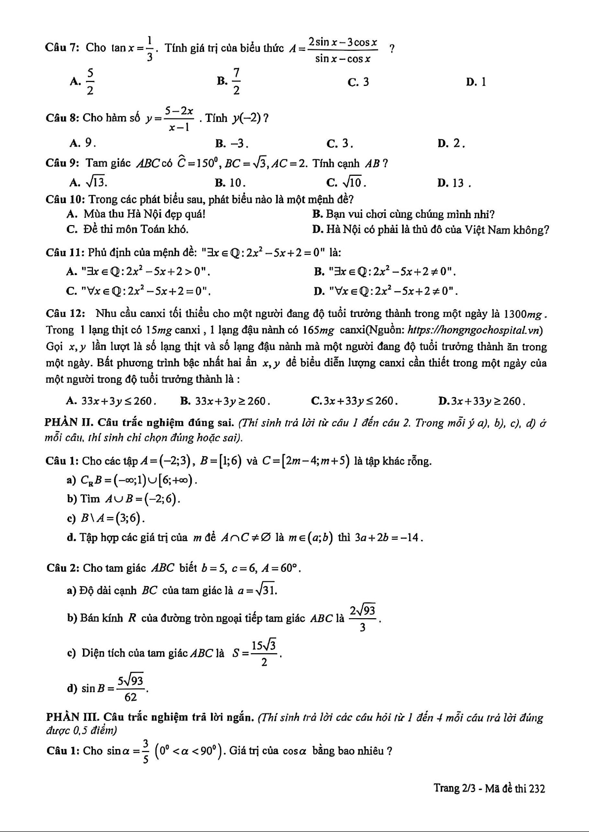 PHẦN I. TRẮC NGHIỆM (3,0 điểm). Mã đề 231 Mã đề 232 Mã đề 233 Mã đề 234 1 D 1 D 1 A 1 B 2 B 2 C 2 A 2 B 3 C 3 A 3 B 3 A 4 C 4 A 4 D 4 D 5 B 5 B 5 C 5 D 6 D 6 C 6 B 6 B 7 C 7 B 7 A 7 A 8 A 8 B 8 C 8 A 9 D 9 A 9 D 9 D 10 B 10 C 10 D 10 C 11 D 11 D 11 B 11 C 12 A 12 D 12 C 12 A
