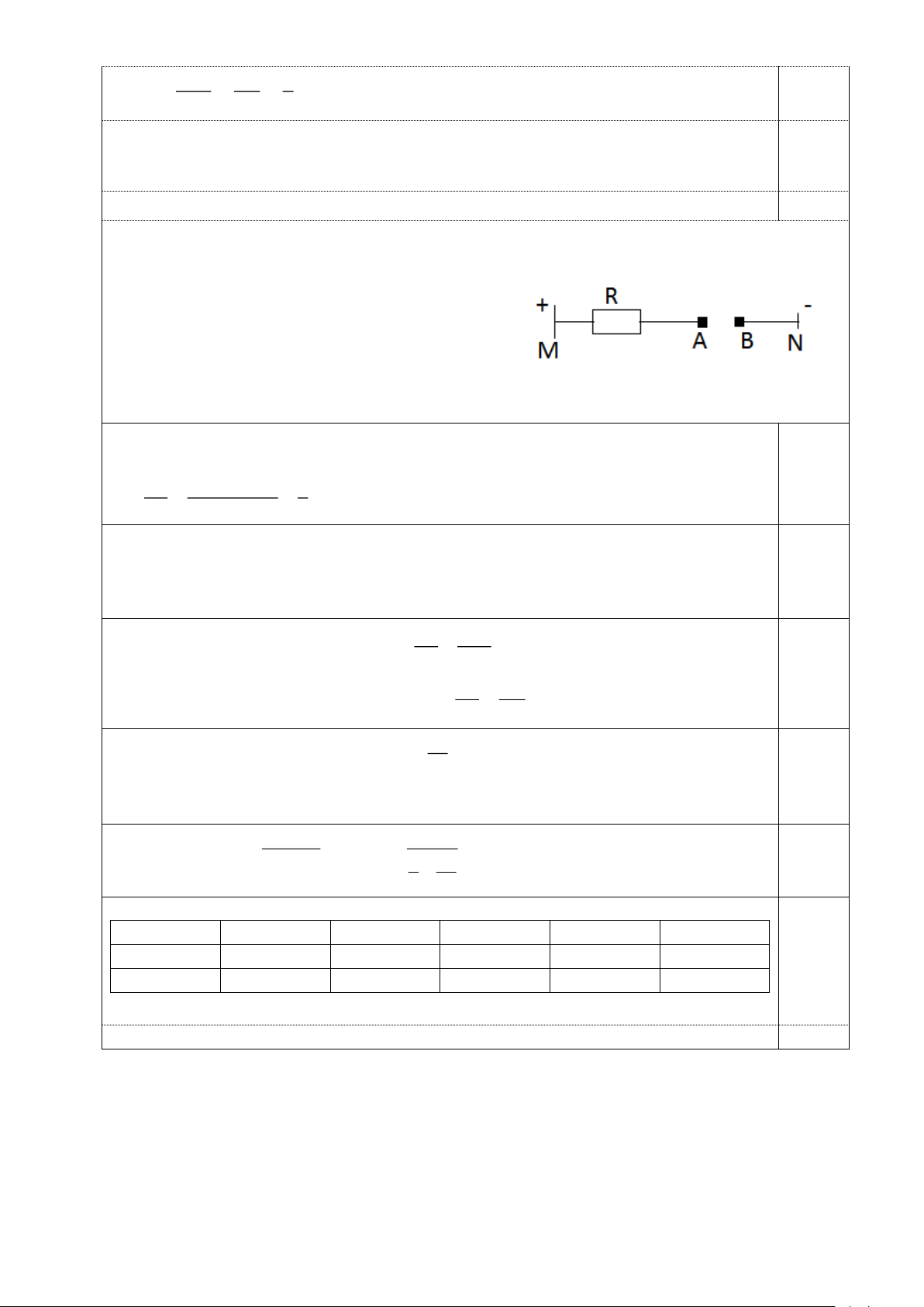 Cường độ dòng điện đi qua R1 là: I1 = I = = = 0,5 A 0,25 R 8 td UMB = I.RMB = 0,5.5 = 2,5V 0,25 U 2,5 1 I MB 2 = = = (A) 0,25 R 7,5 3 2 Trang 9 U 2,5 1 I MB 3 = = = (A) 0,25 R 15 6 3 1. c (0,5 điểm)