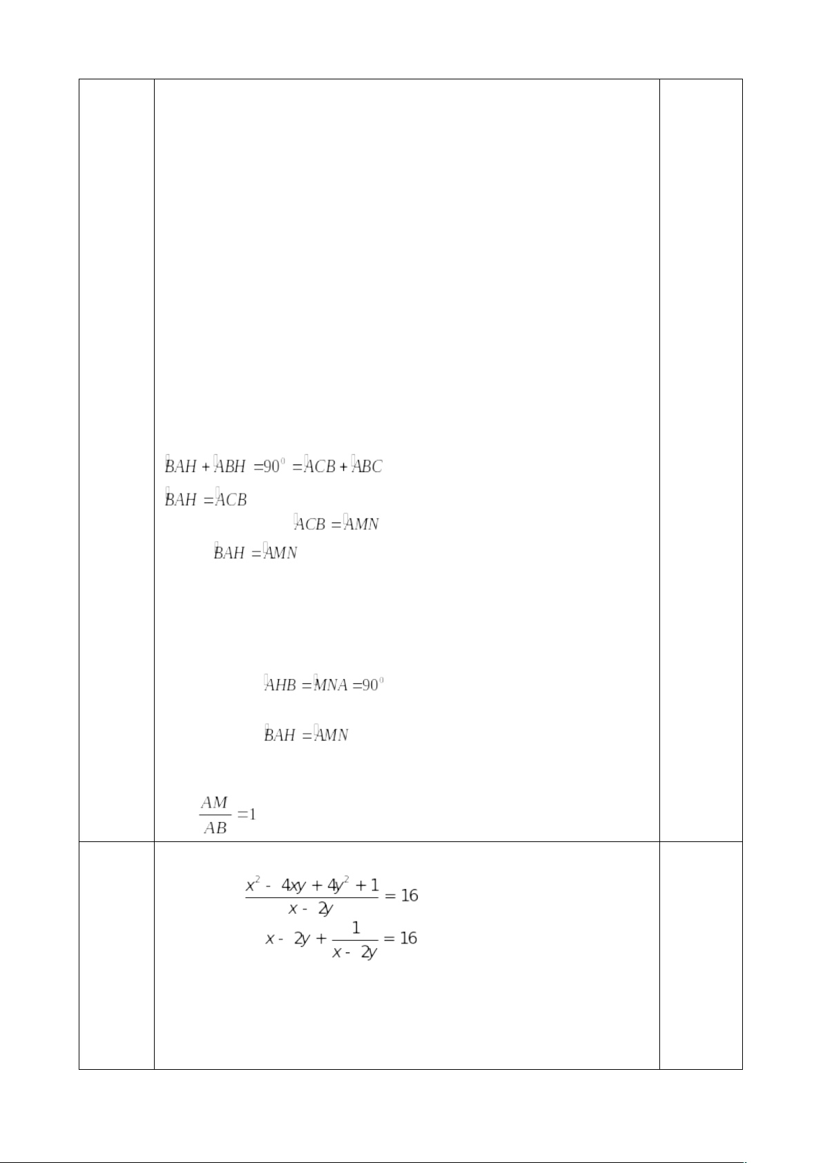 Do đó, ΔABH = ΔMAN (g-c-g) Suy ra AB = AM Vậy | 0,25 0,25 0,25 0,25 0,25 0,25 0,5đ | |