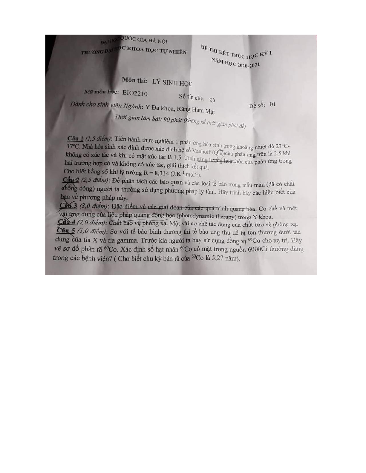 Các câu hỏi lý thuyết lý sinh qua các năm | Lý sinh học | Trường Đại học Y Dược , Đại học Quốc gia Hà Nội