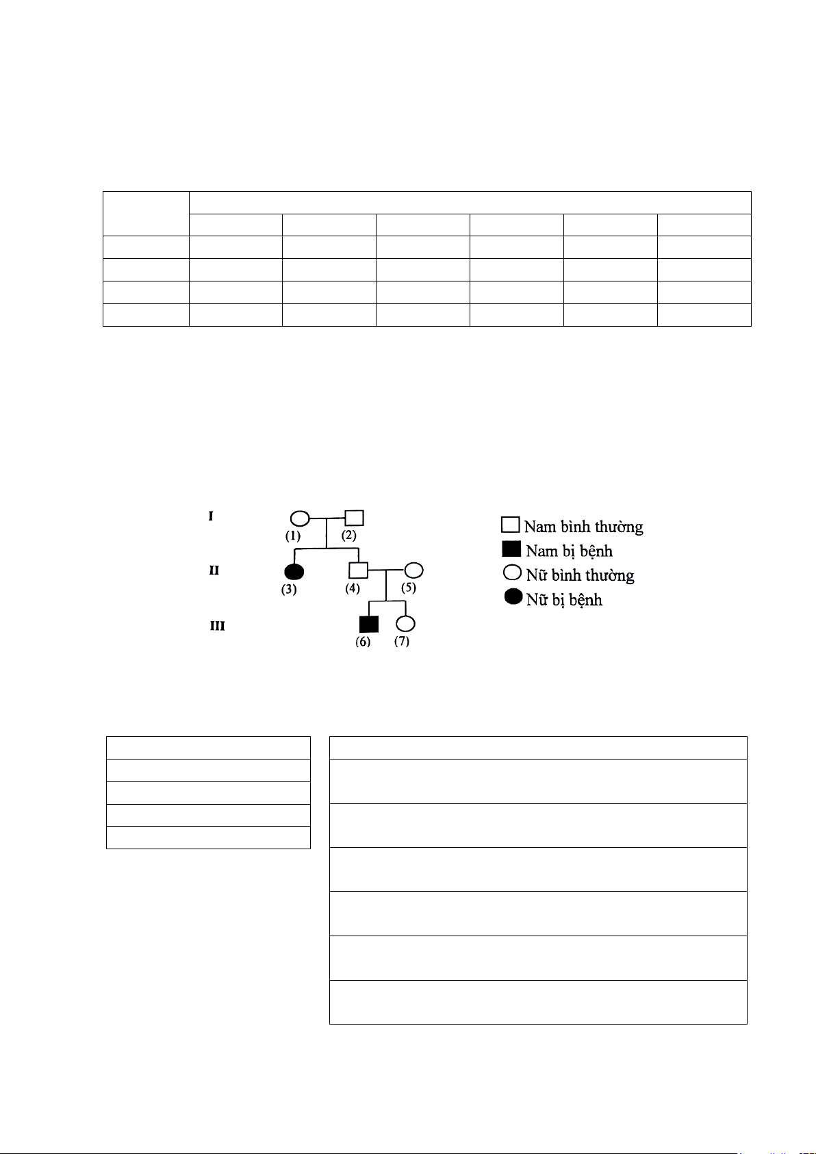 Câu 1. Sơ đồ phả hệ dưới đây theo dõi sự di truyền của một bệnh hiếm gặp ở những người trong một gia đình qua ba thế hệ.