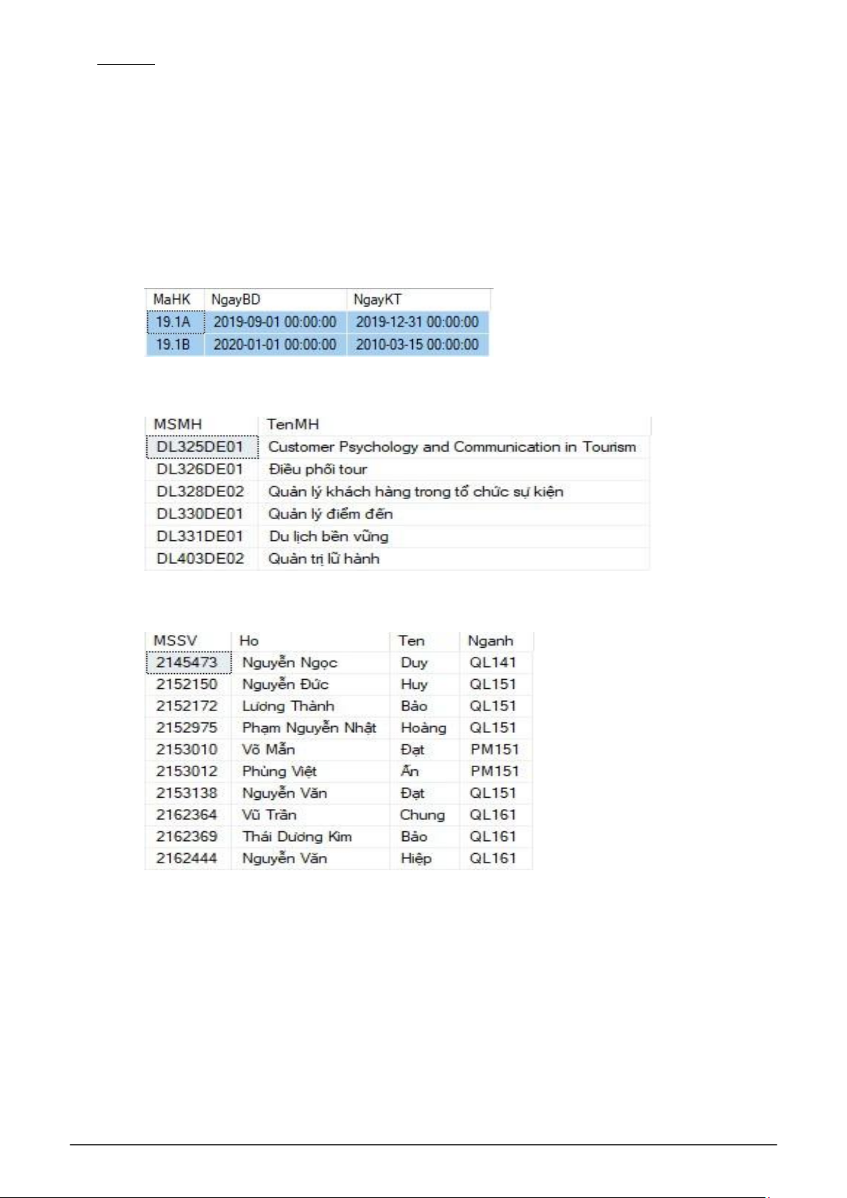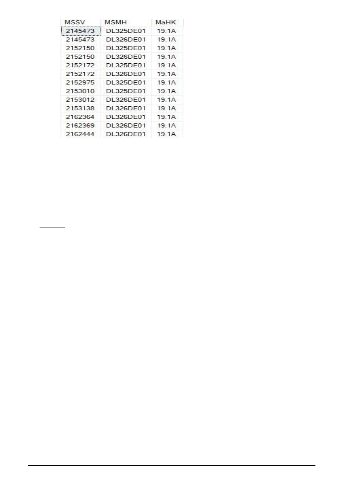 là khóa ngoại tham chiếu đến MonHoc(MSMH), MaHK là khóa ngoại tham chiếu đến  Hocky(MAHK)  Thi CK – Hệ QT C SD L  Trang 5 / 7      lOMoAR cPSD| 47206071    Câu 1: (2 điểm)