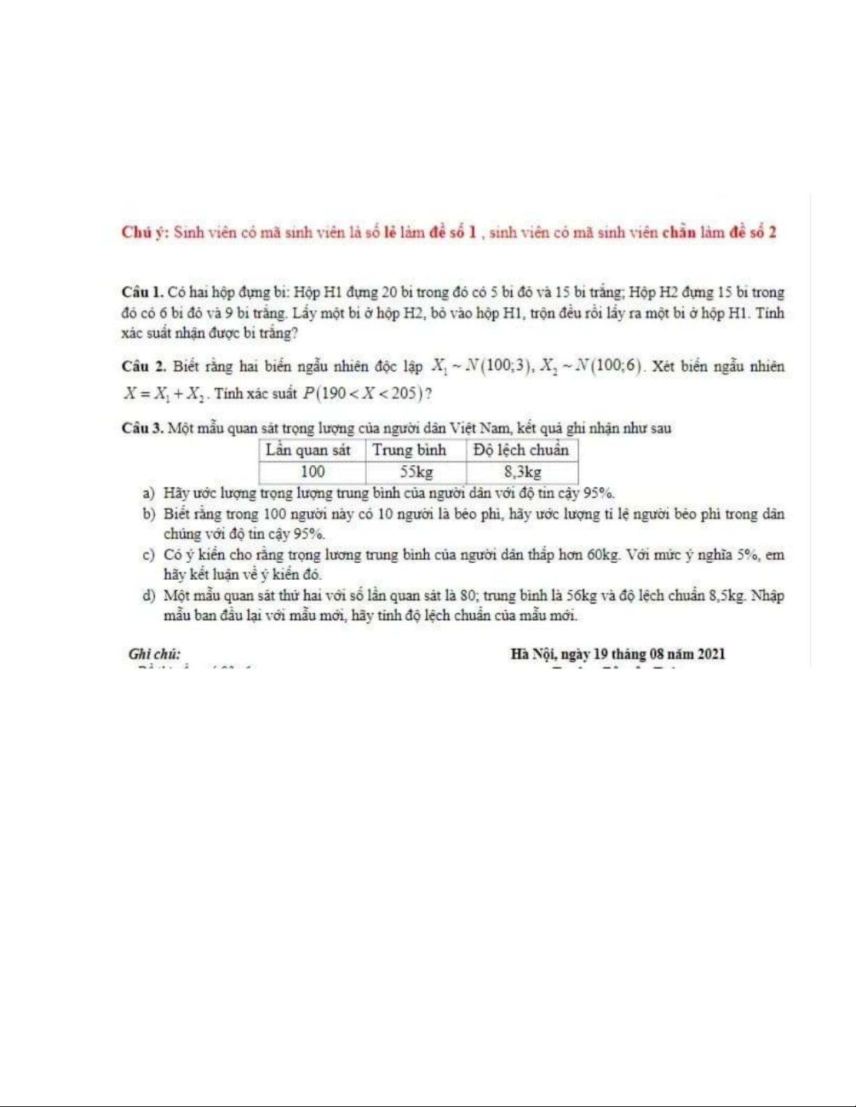 Đề thi cuối kỳ lý thuyết môn Xác suất thống kê| Trường Đại học Ngoại Thương