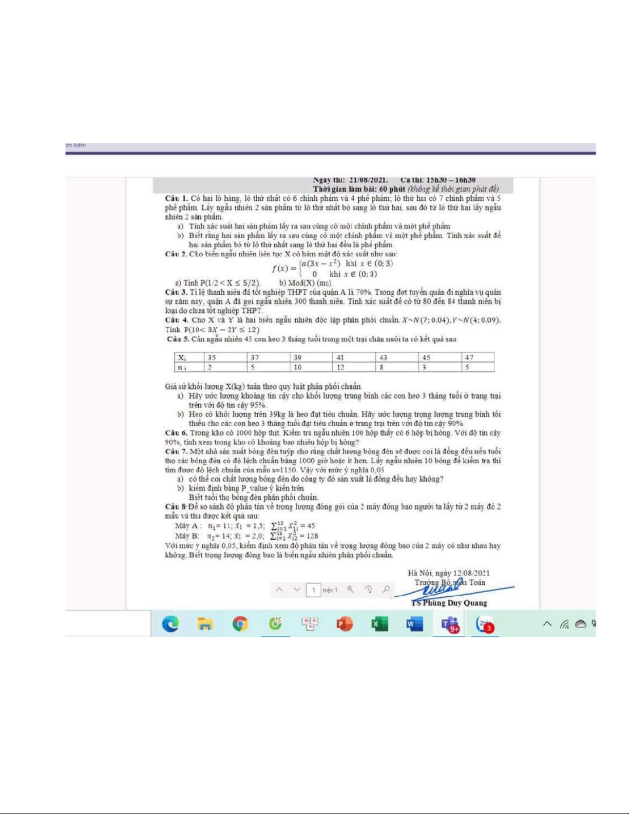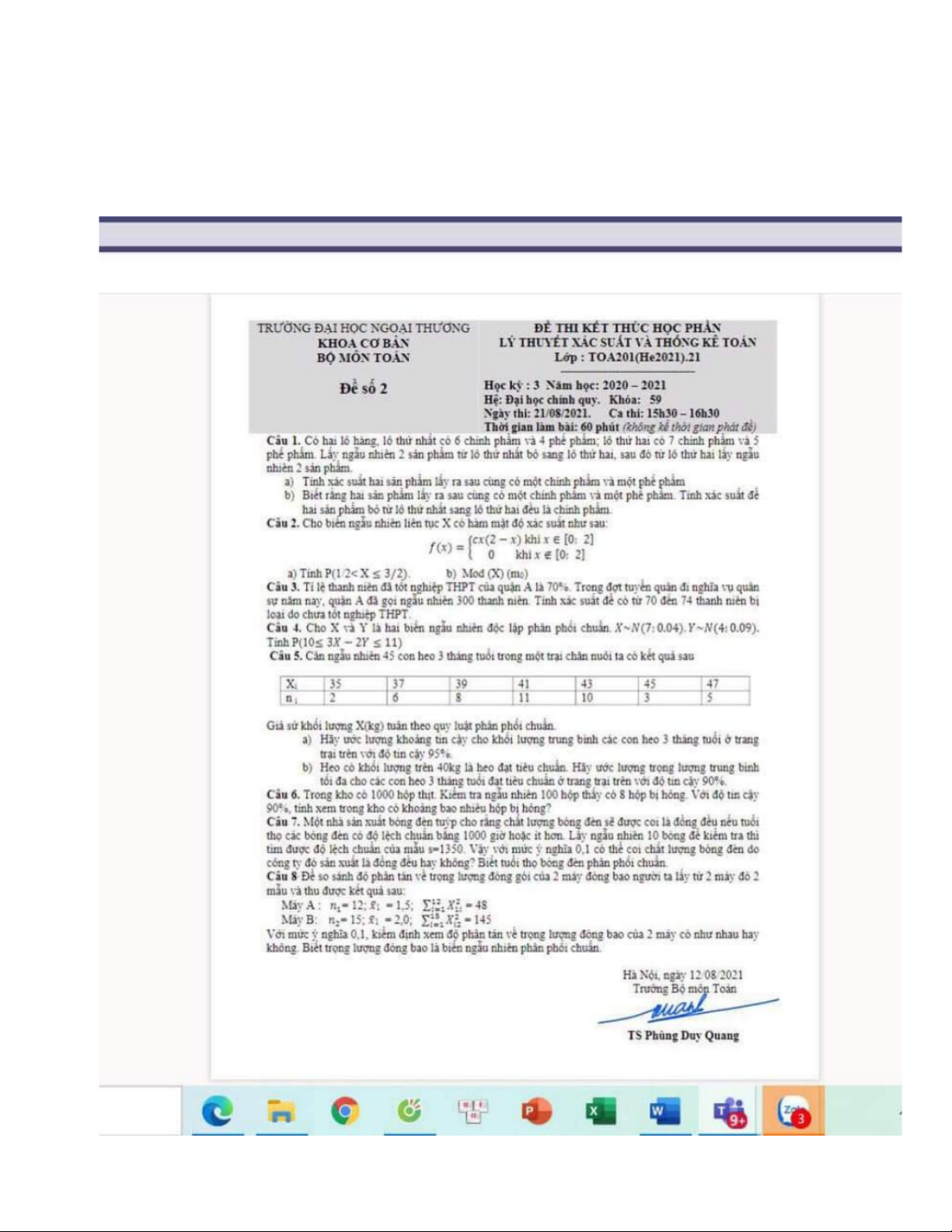 Đề thi cuối kỳ học phần môn Xác suất thống kê| Trường Đại học Ngoại Thương
