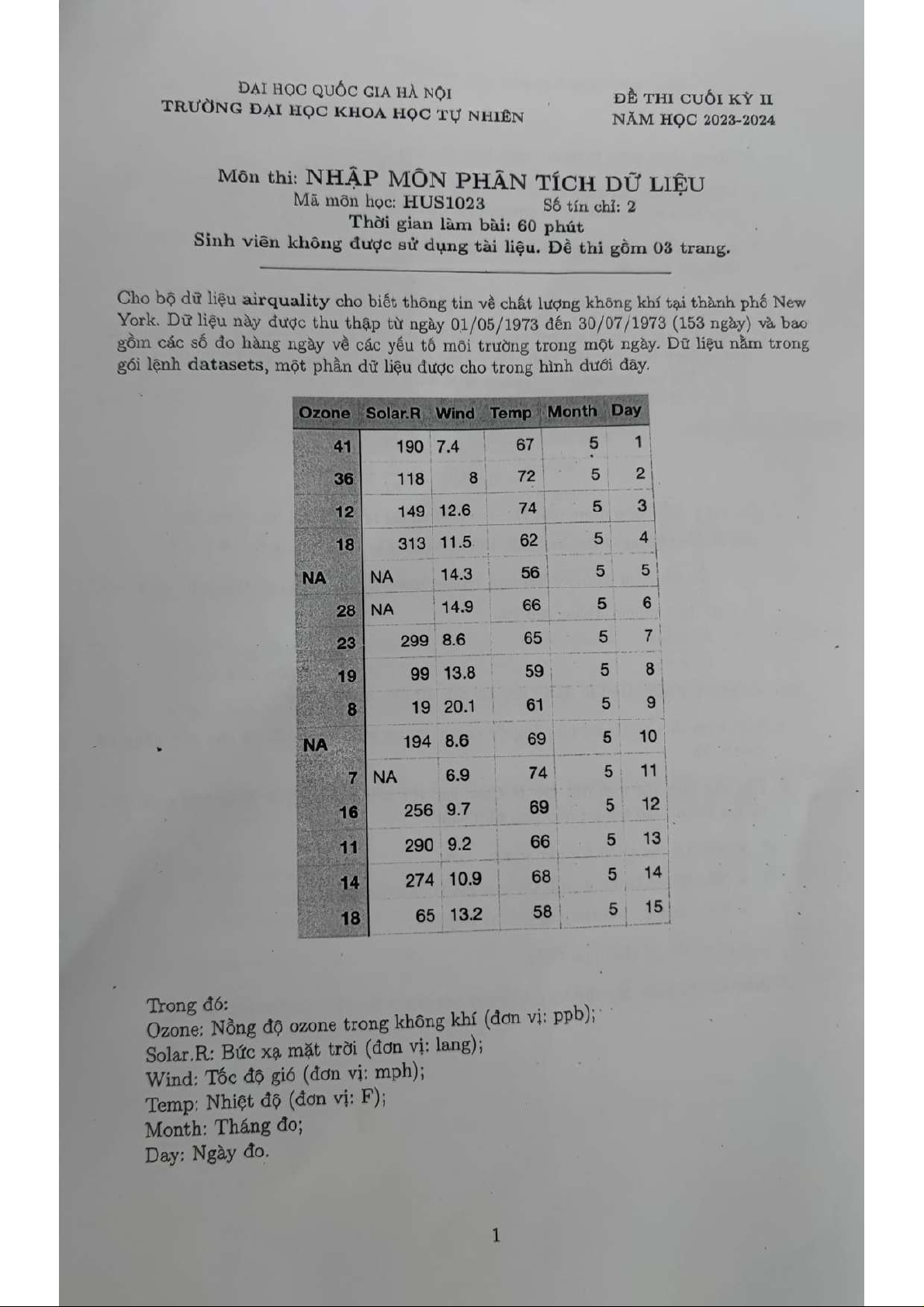 Đề thi cuối kỳ II năm học 2023-2024 môn Nhập môn phân tích dữ liệu | Trường Đại học Khoa học tự nhiên, Đại học Quốc gia Hà Nội