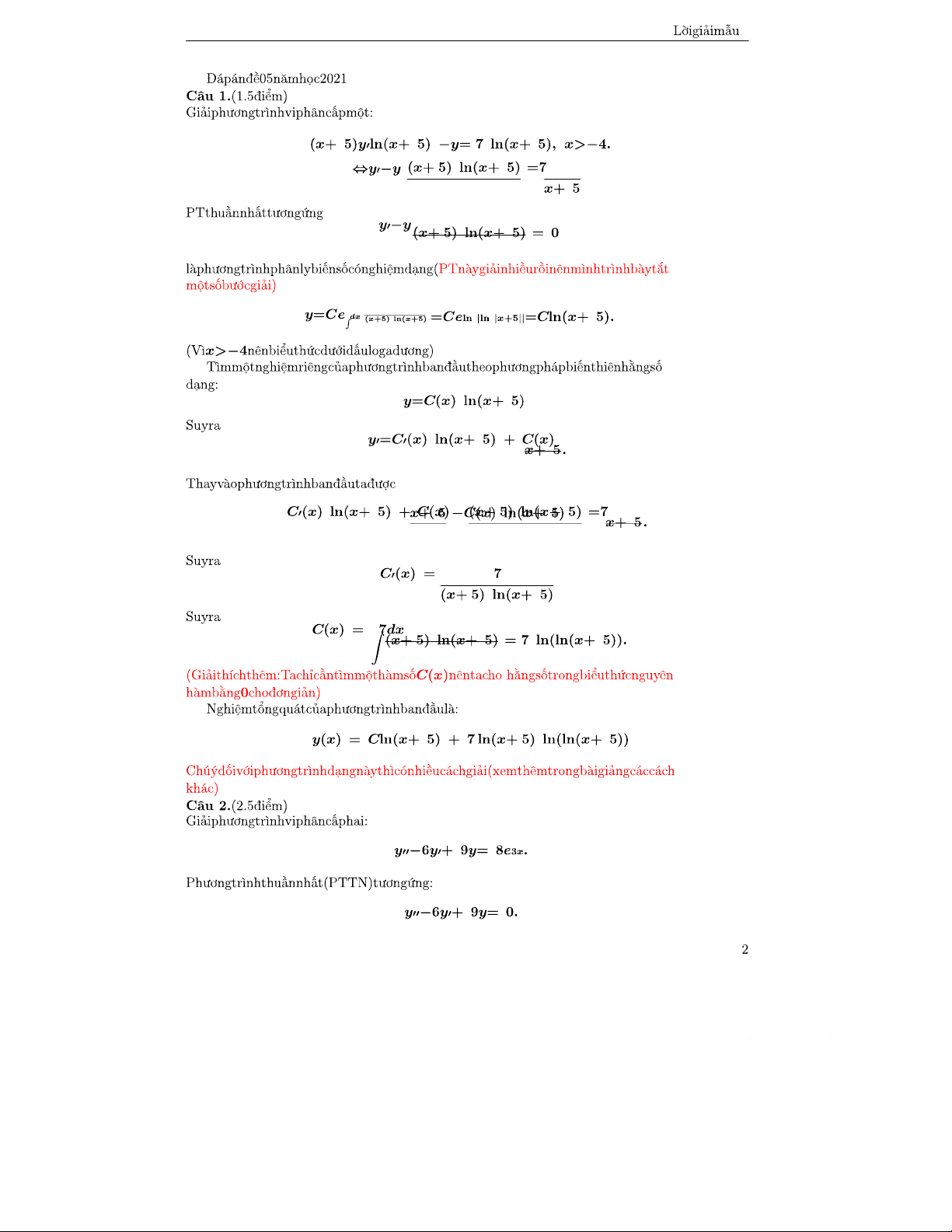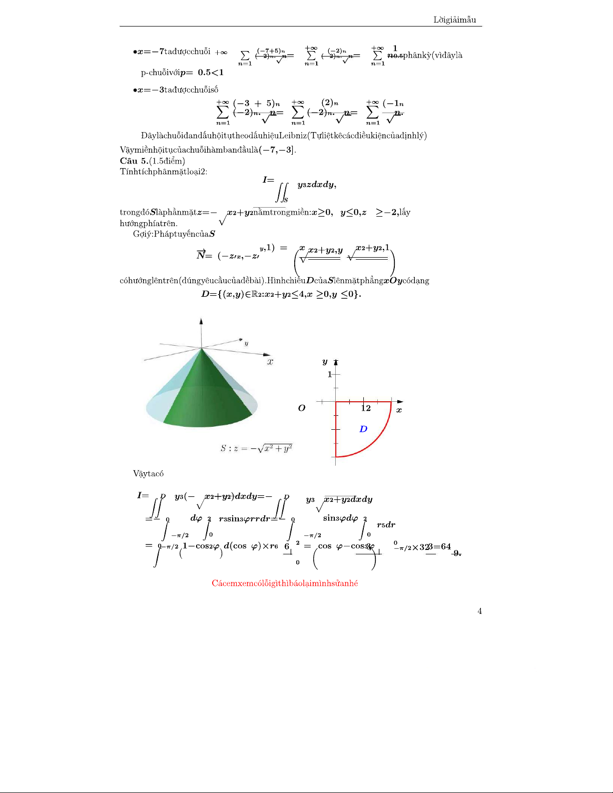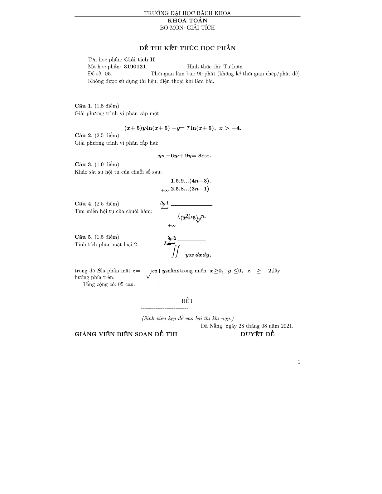 Đề thi cuối kỳ môn Giải tích 2 - Mã học phần 3190121, Đề số 05