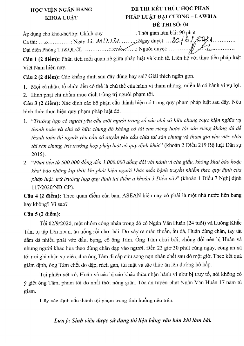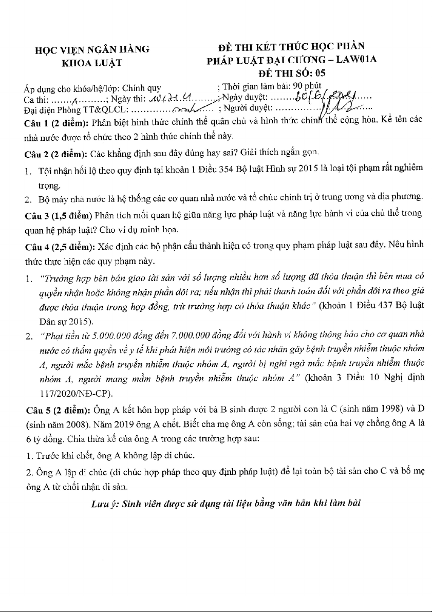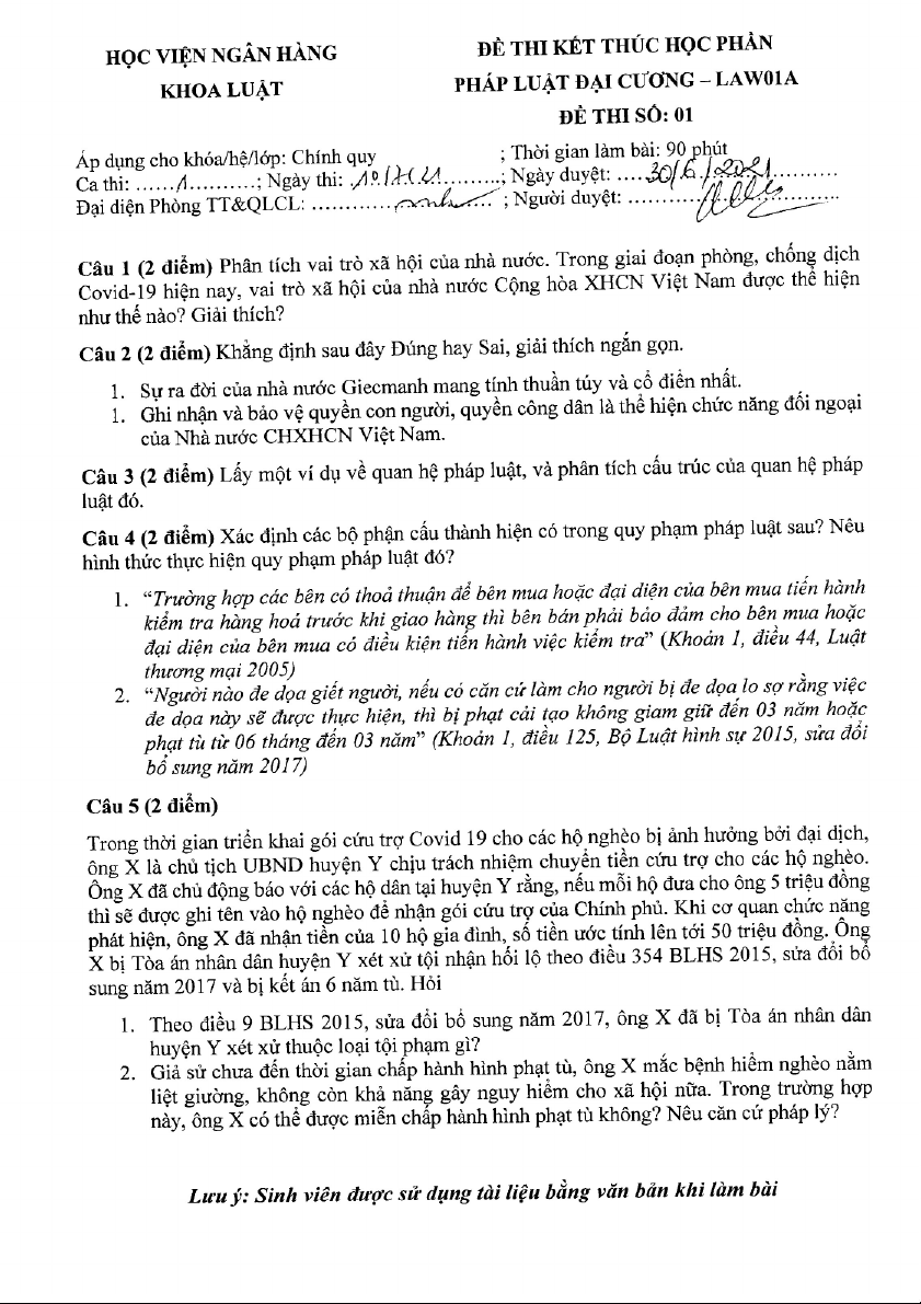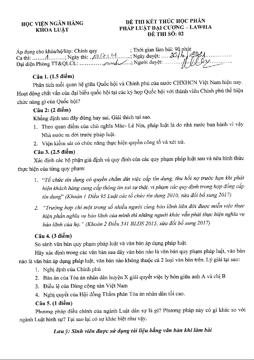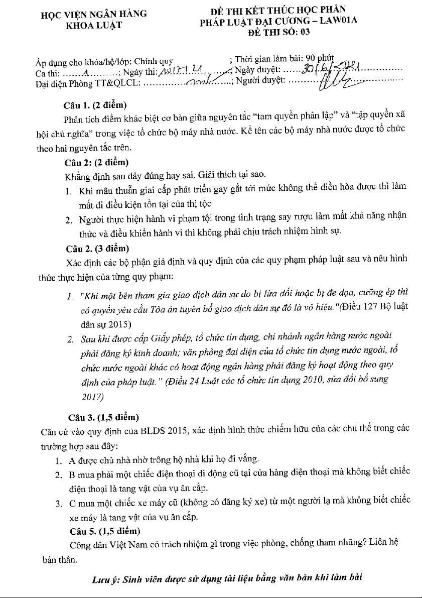 Đề thi cuối kỳ môn Pháp luật đại cương | Học viện Ngân hàng