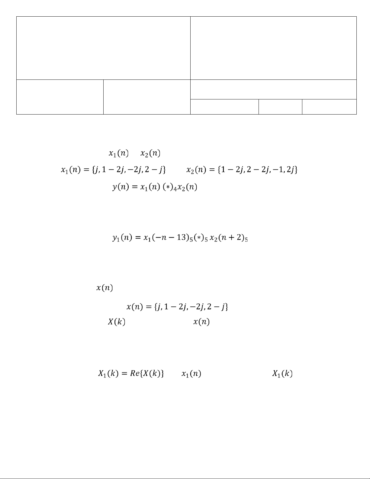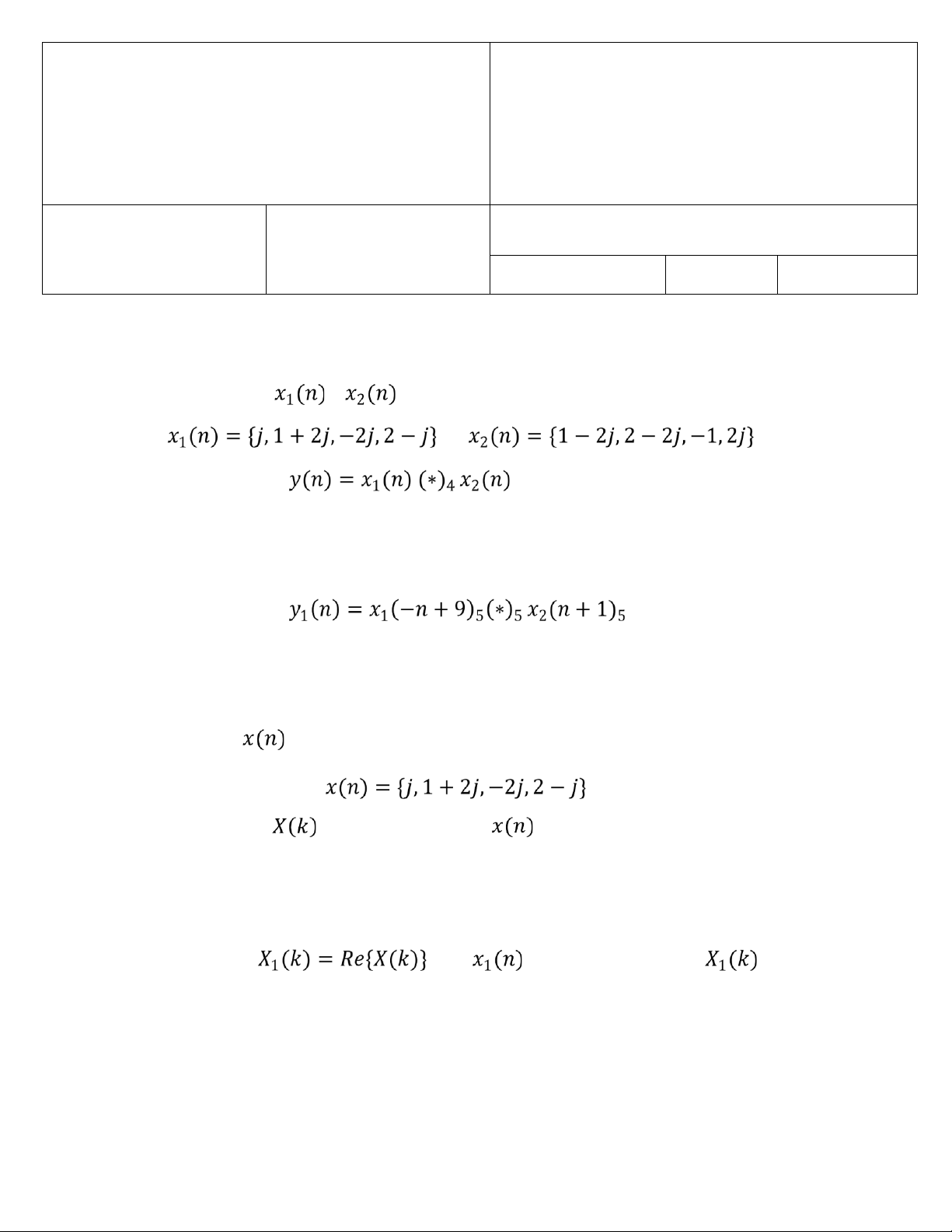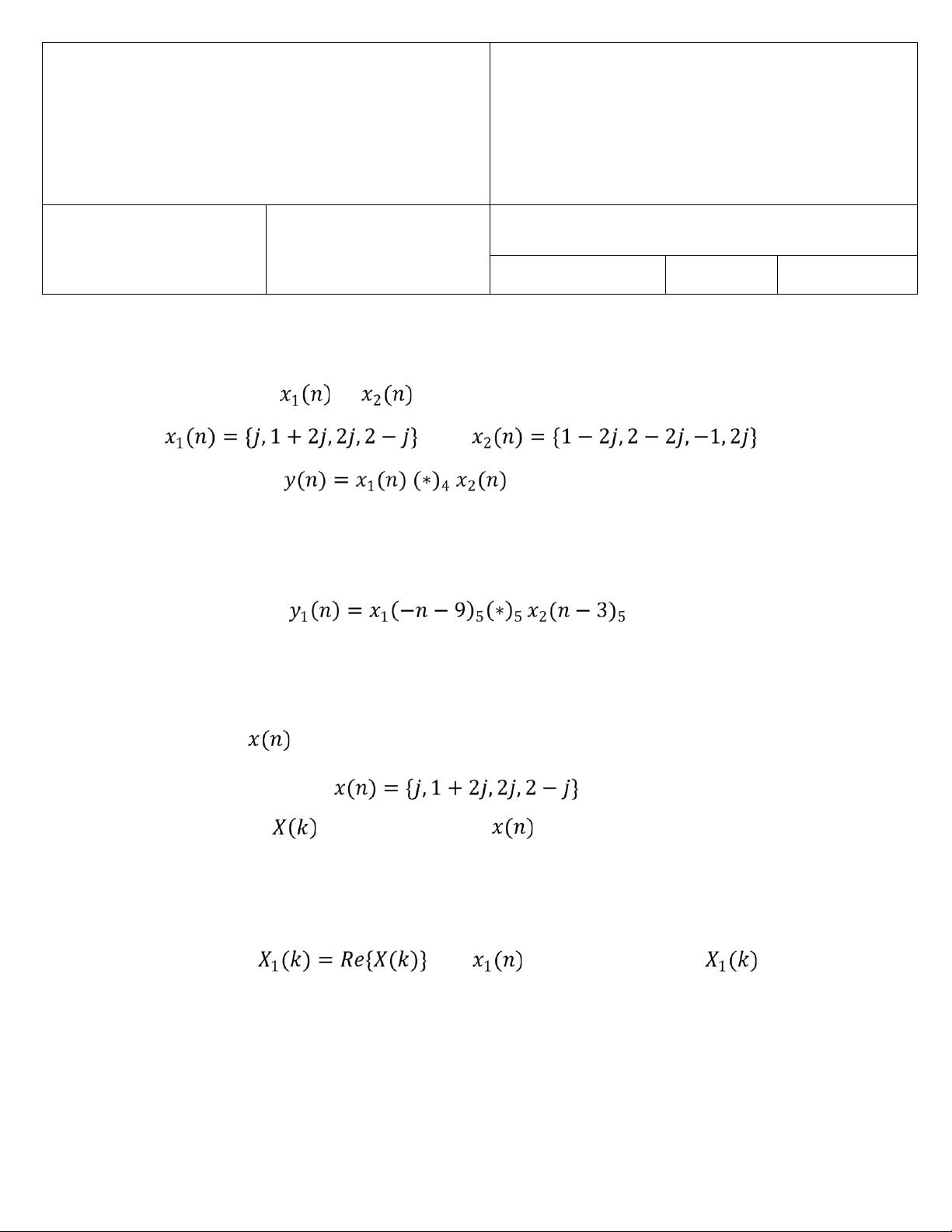 Câu 1. Cho hai tín hiệu và như sau: và a. (2 điểm) Tìm . b. (1 điểm) Tìm . Câu 2. Cho tín hiệu như sau: a. (1.5 điểm) Tìm là DFT 4-điểm của . b. (1 điểm) Với , tìm là IDFT 4-điểm của .