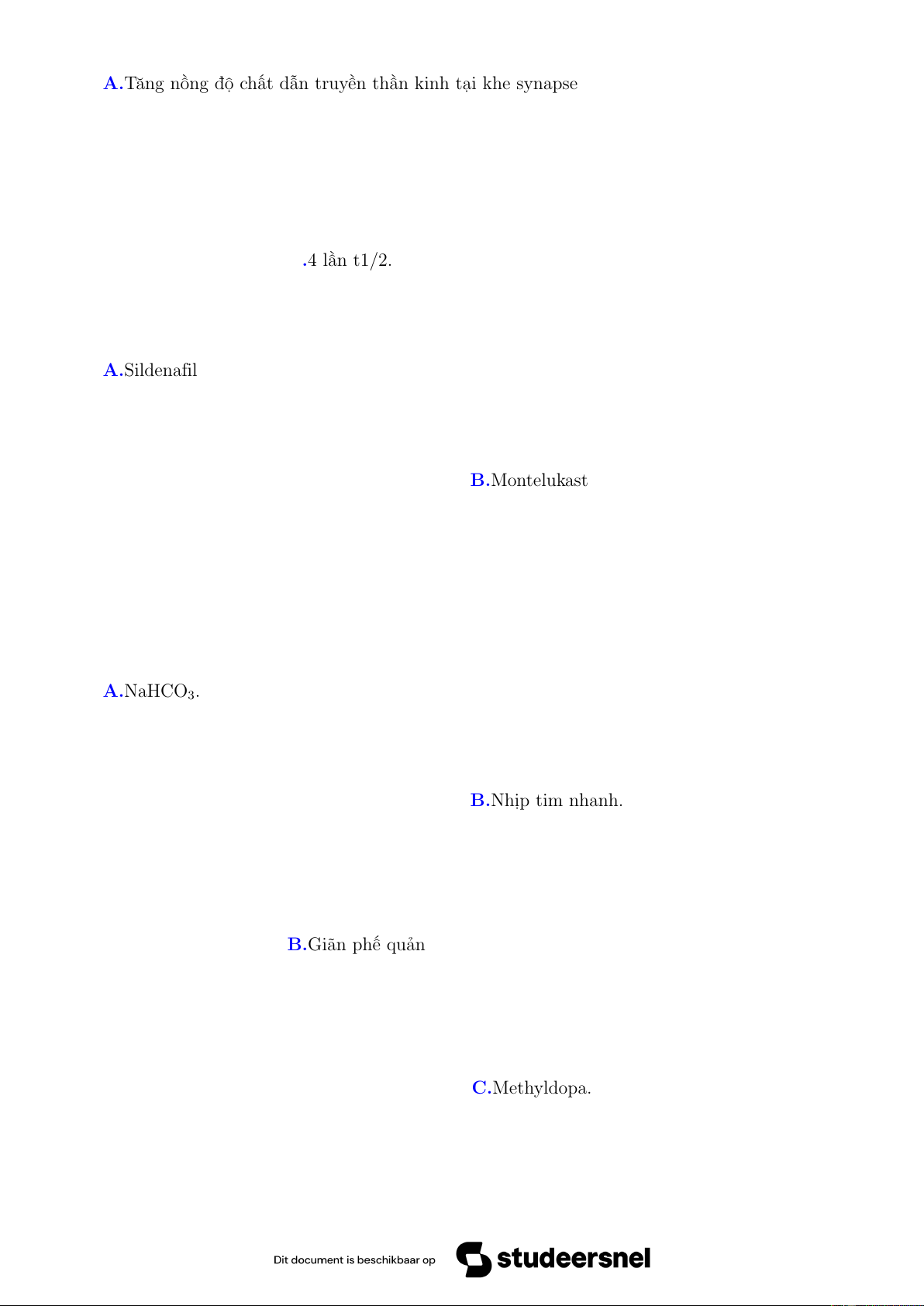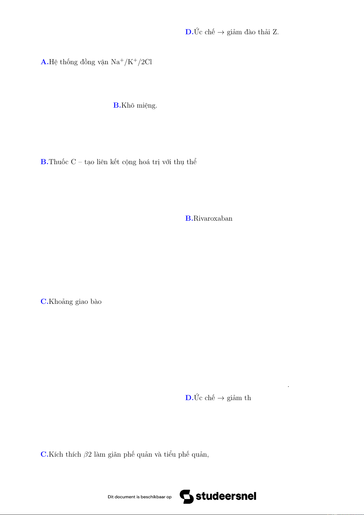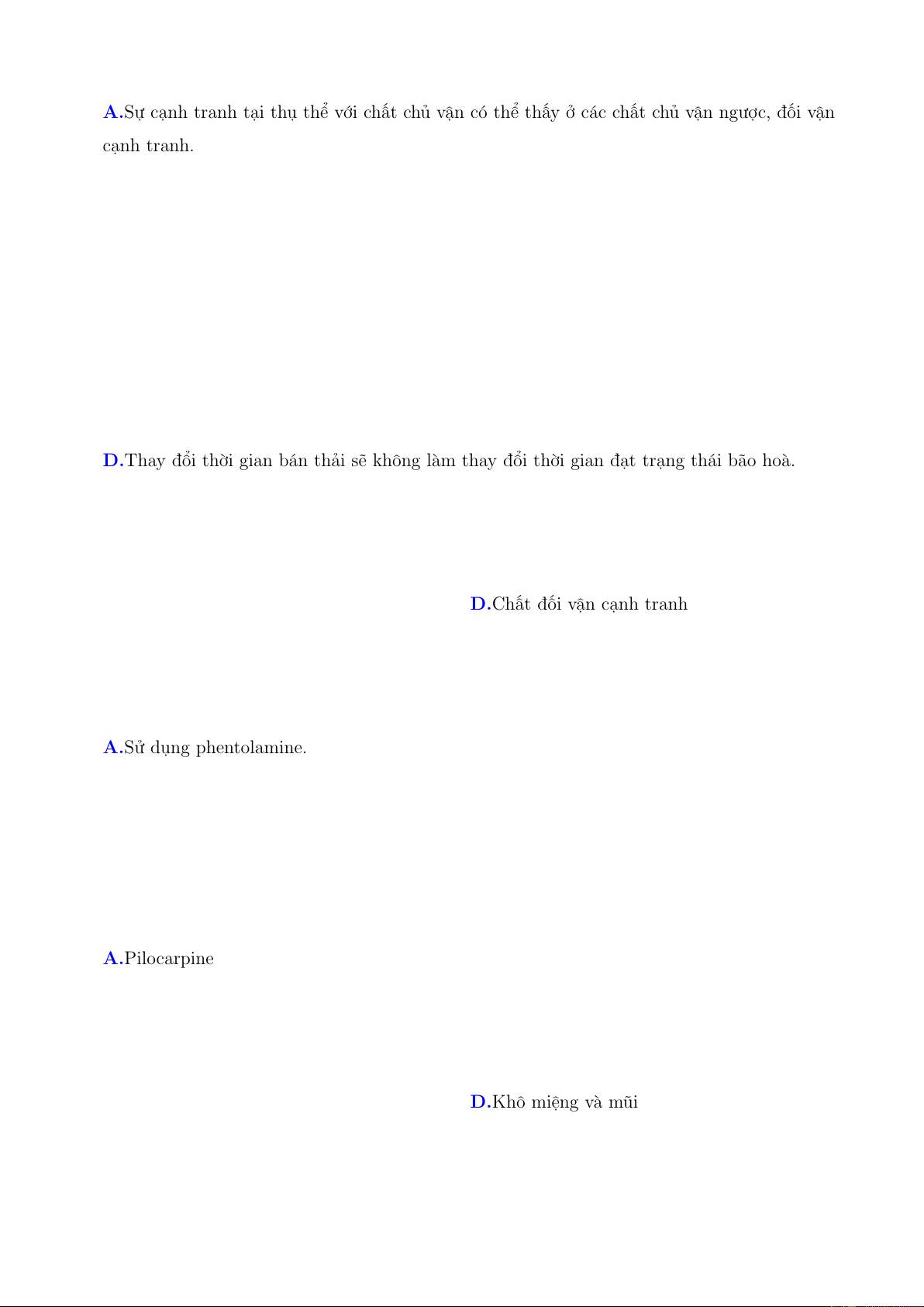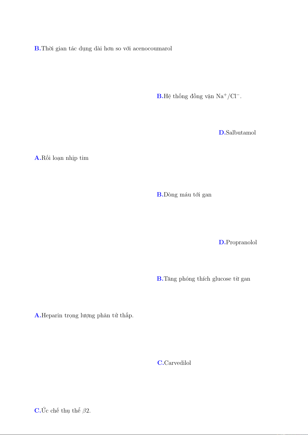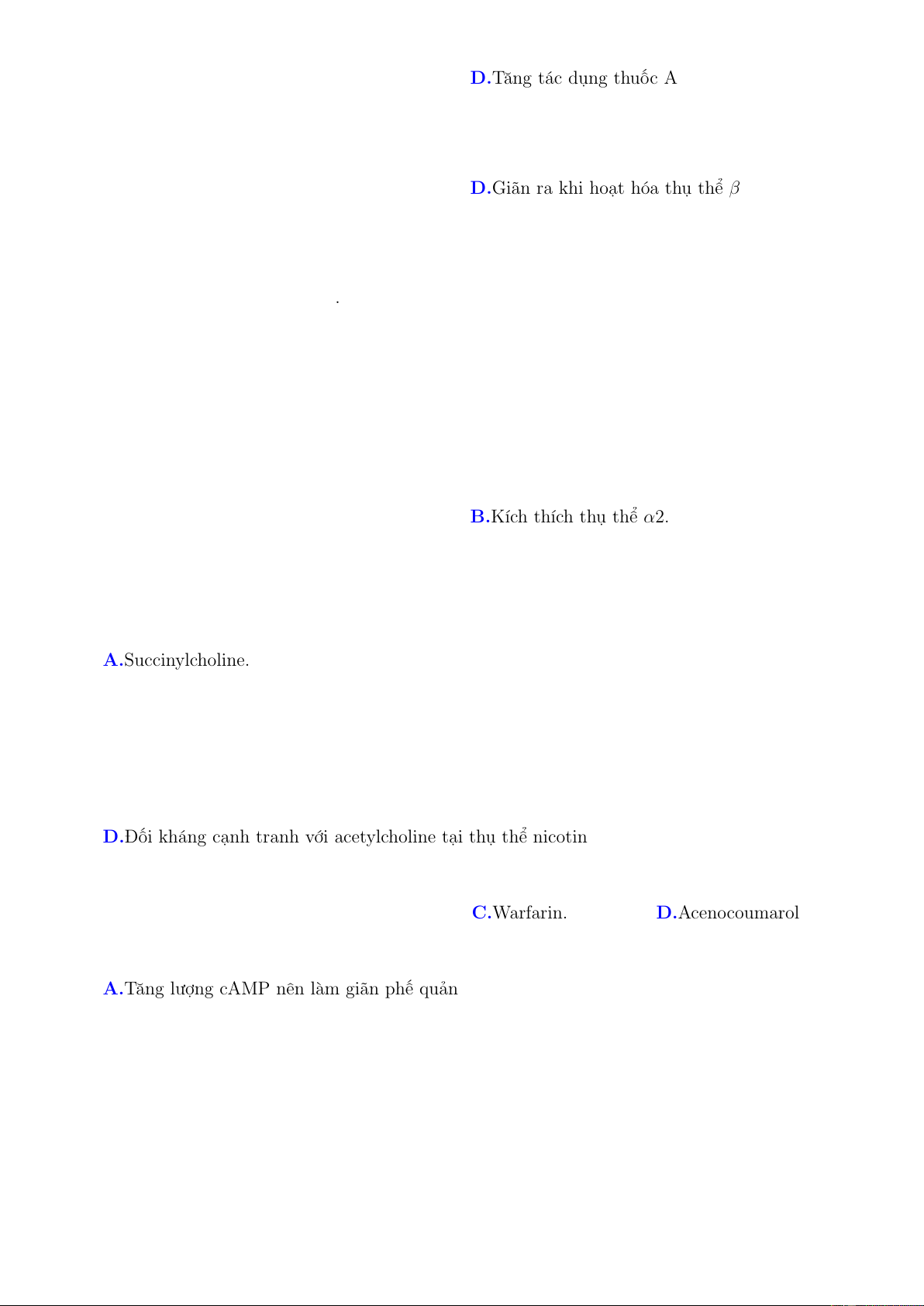 Câu 47. Thuốc nào sau đây KHÔNG NÊN sử dụng ở bệnh nhân bị bệnh động mạch chi dưới do xơ vữa? A.Ức chế thụ thể α1. B.Ức chế kênh Canxi. C.Ức chế thụ thể β2.