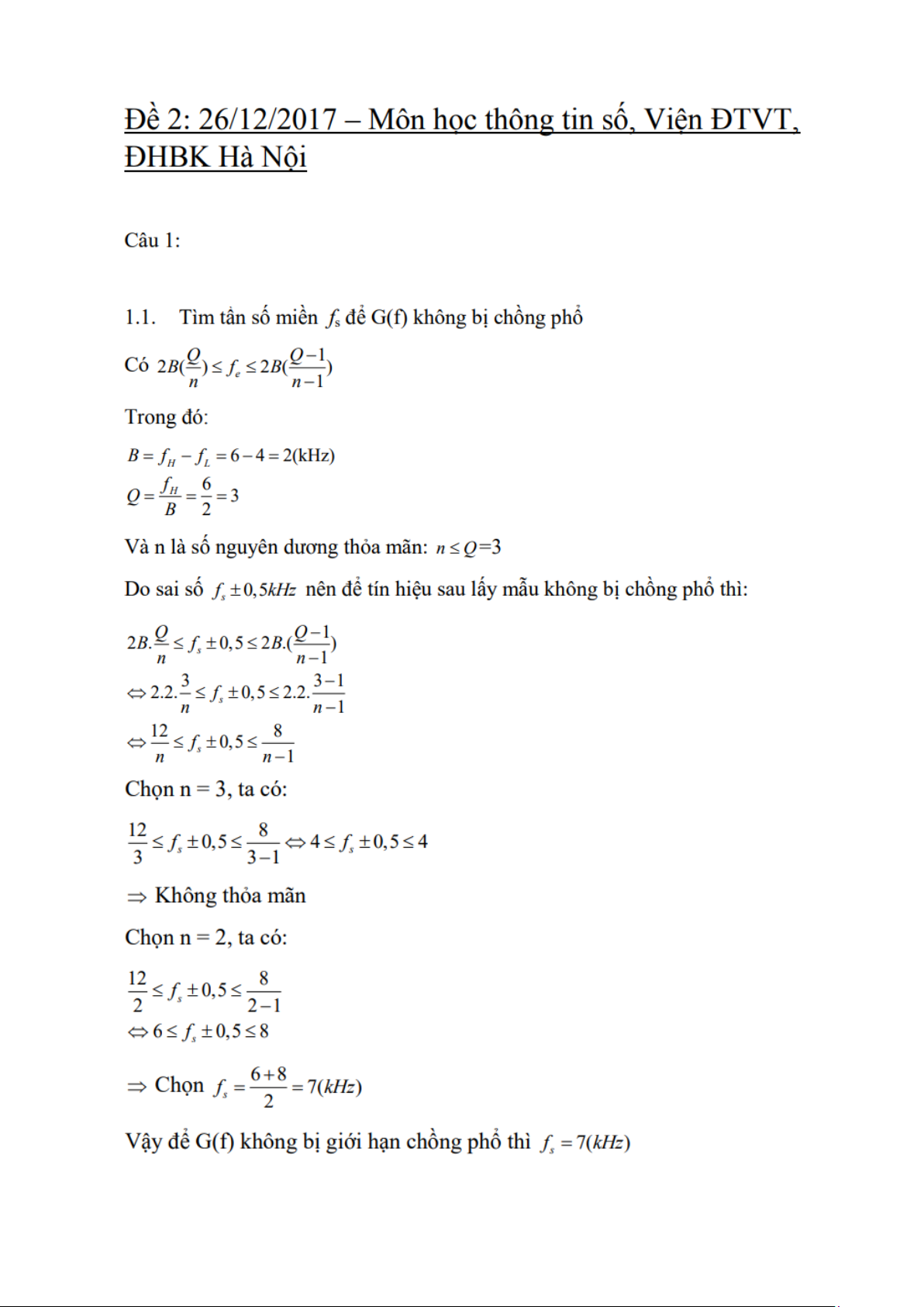 Tài liệu ôn thi giữa kỳ môn Thông tin số | Trường Đại học Bách Khoa Hà Nội