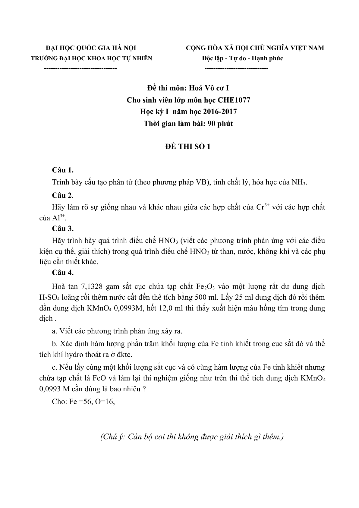 (Chú ý: Cán bộ coi thi không được giải thích gì thêm.)