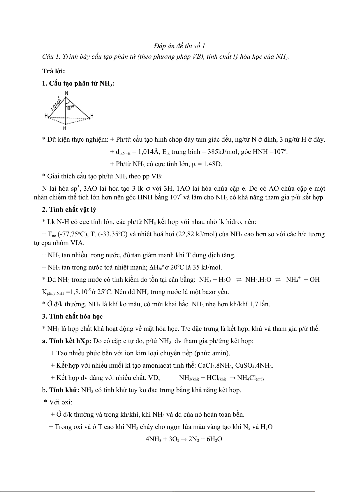 Câu 1. Trình bày cấu tạo phân tử (theo phương pháp VB), tính chất lý hóa học của NH3. Trả lời: