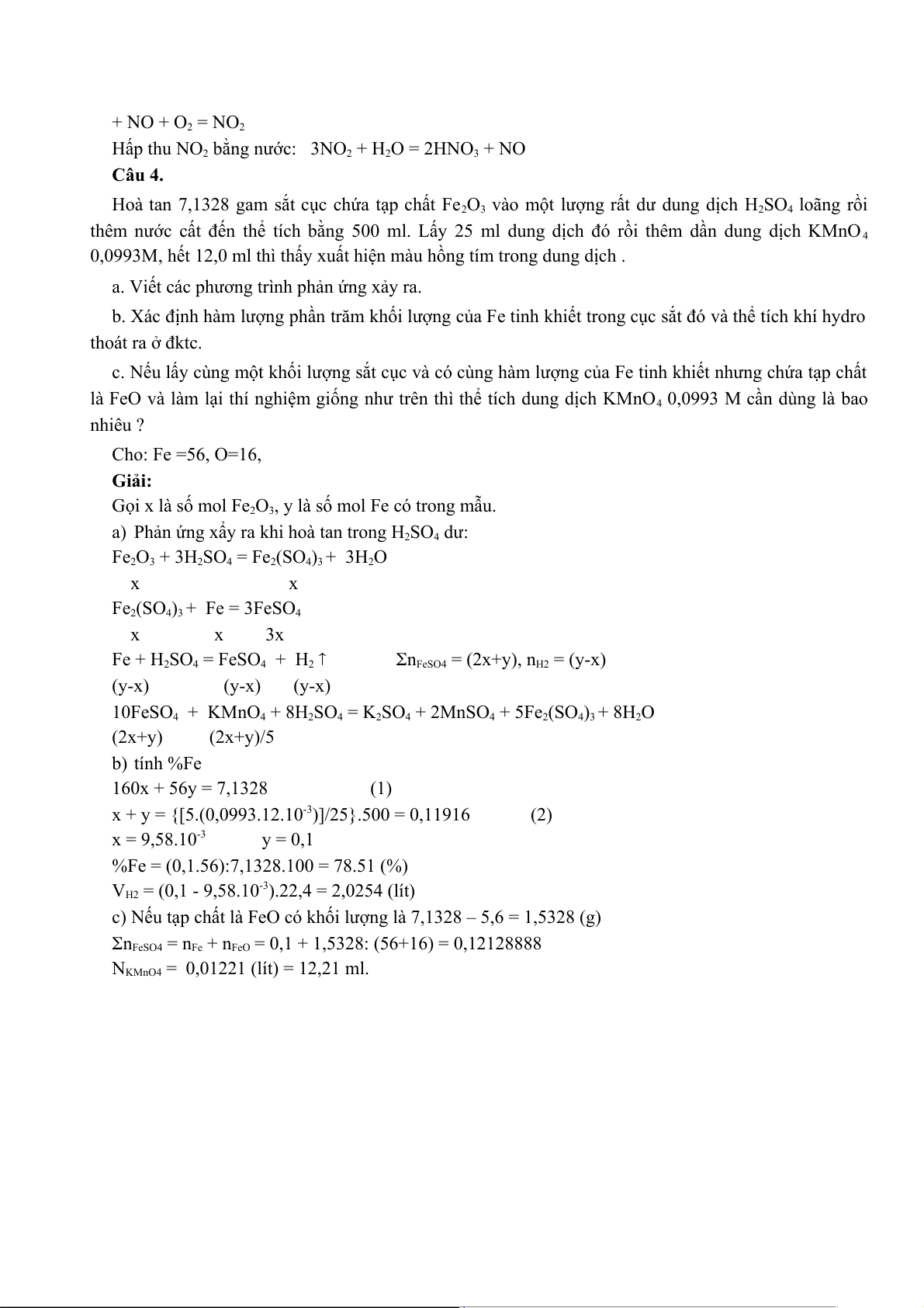 2 nFeSO4 = (2x+y), nH2 = (y-x) (y-x) (y-x) (y-x) 10FeSO4 + KMnO + 8H 4 SO 2 4 = K2SO4 + 2MnSO4 + 5Fe (SO 2 4)3 + 8H O 2 (2x+y) (2x+y)/5 b) tính %Fe 160x + 56y = 7,1328 (1)