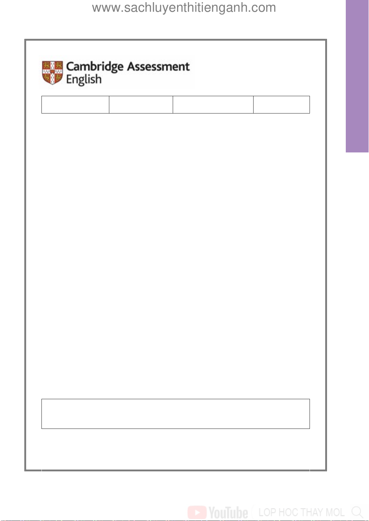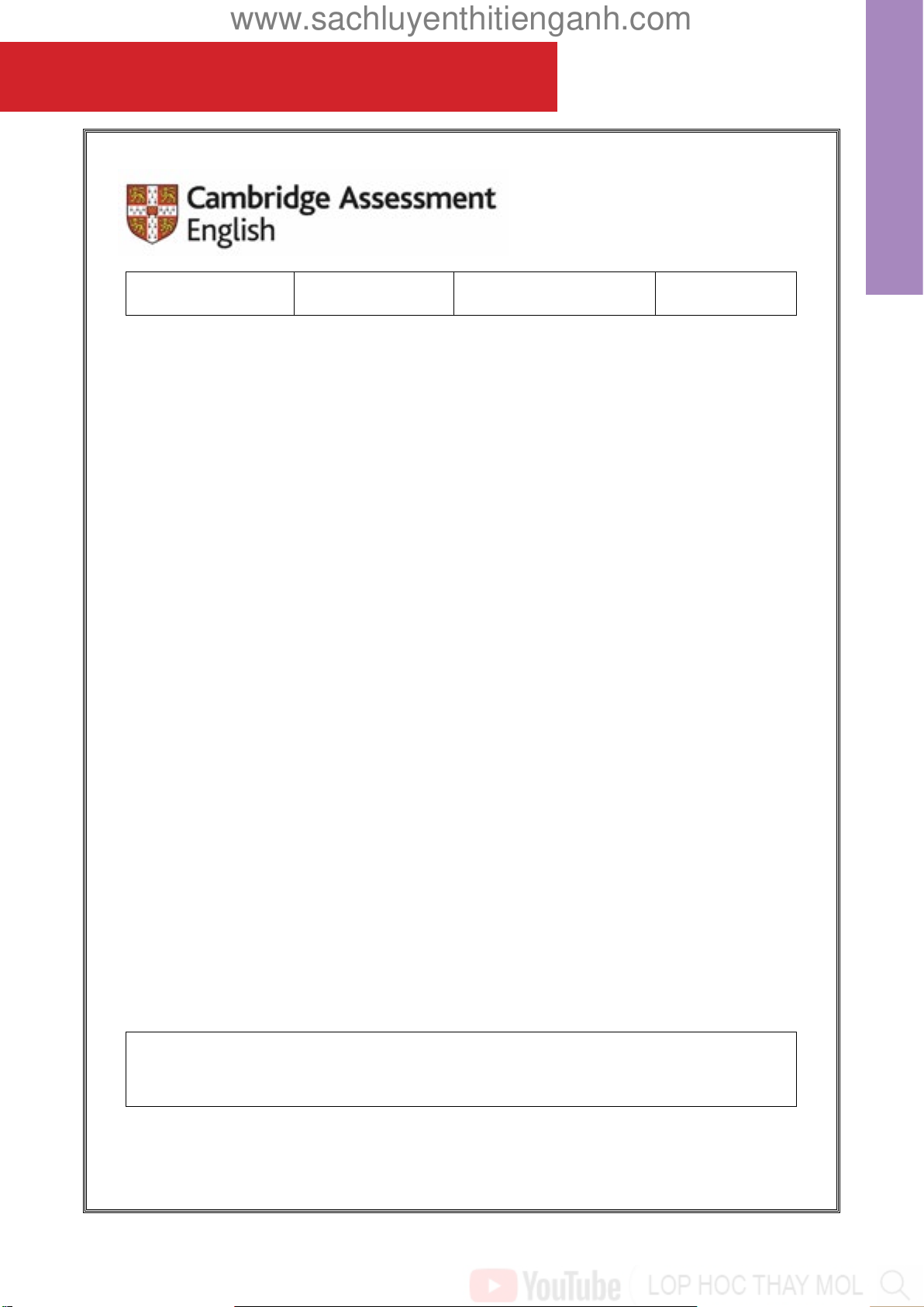 Would you like to colour it pink? Fch Yes! PAUSE 00’15” Pre A1 Starters 13 www.sachluyenthitienganh.com Blank page 14 Cambridge Assessment English www.sachluyenthitienganh.com riting and W Reading s Centre Number Candidate Number Starter e A1 Pr Pre A1 Starters Reading and Writing There are 25 questions. You have 20 minutes. You wil need a pen or pencil. My name is: