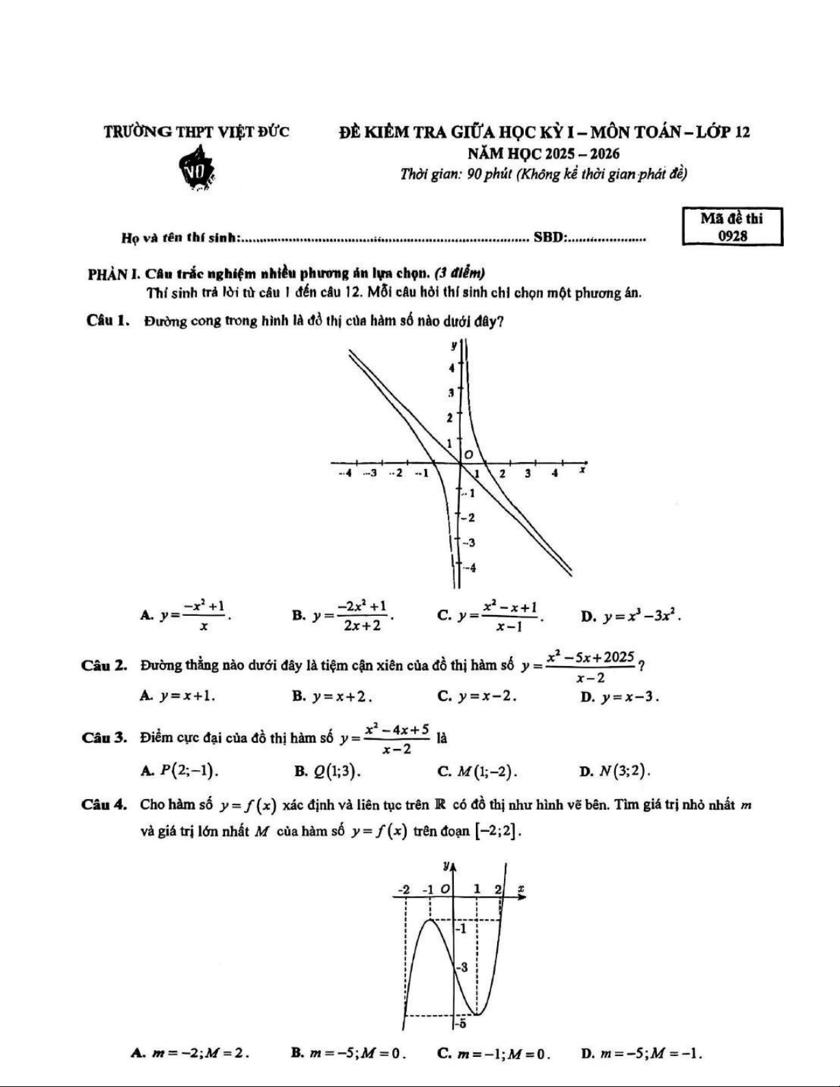 Đề thi giữa học kì 1 môn Toán 12 trường THPT Việt Đức - Hà Nội