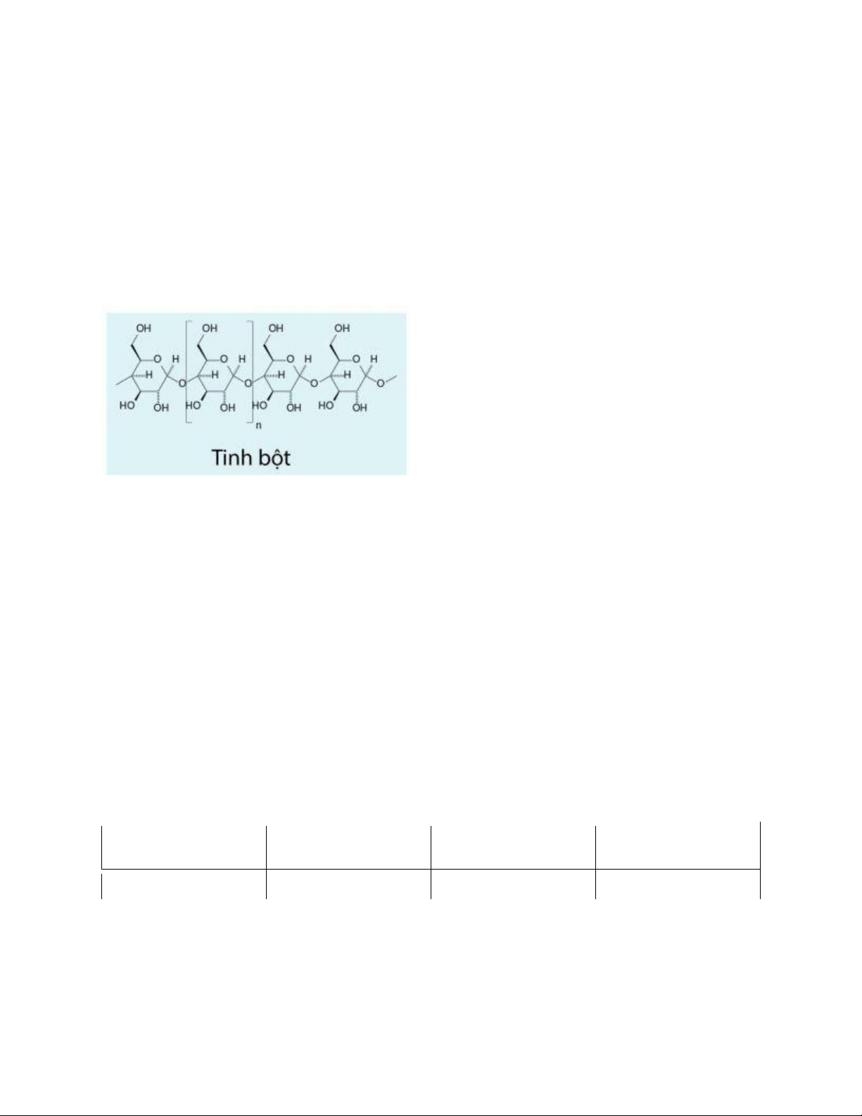 Câu 12. Công thức phân tử của tinh bột là A. C6H5OH. B. C6H12O6. C. CH3OOCH3. D. (C6H10O5)n.