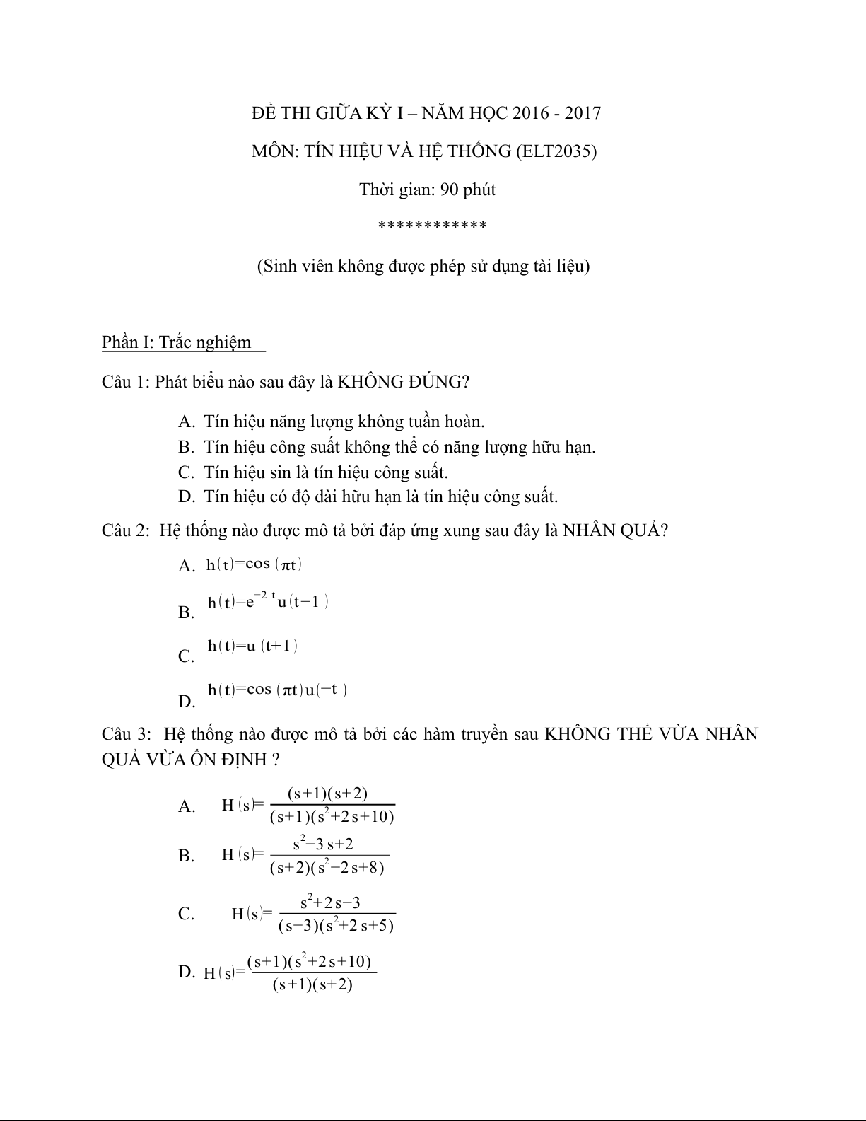 MÔN: TÍN HIỆU VÀ HỆ THỐNG (ELT2035) Thời gian: 90 phút ************