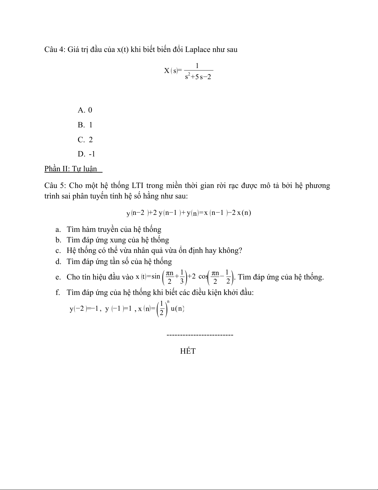 Câu 4: Giá trị đầu của x(t) khi biết biến đổi Laplace như sau 1 X ( s)= s2+5s−2 A. 0 B. 1 C. 2 D. -1 Phần II: Tự luận