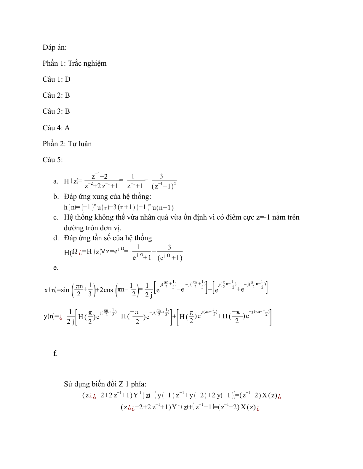 y(−2 )=−1 , y (−1 )=1 , x (n)= (1 )n u(n) 2 ------------------------- HẾT Đáp án: Phần 1: Trắc nghiệm Câu 1: D Câu 2: B Câu 3: B Câu 4: A Phần 2: Tự luận Câu 5: z−1−2 1 3 a. H ( z)= = − z−2+2 z−1+1 z−1+1 (z−1+1)2