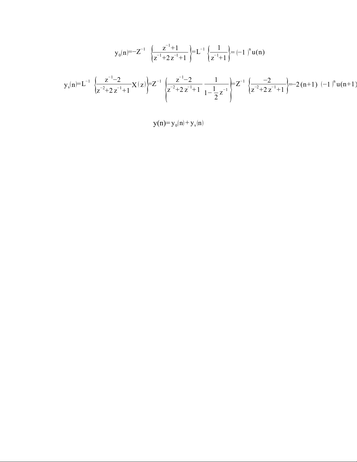 y (n)=−Z−1 { z−1+1 }=L−1 { 1 }= (−1 )nu(n) 0 z−1+2 z−1+1 z−1+1 1 y ( }=−2(n+1) (−1)nu(n+1) s n )= L−1 { z−1−2 X ( z )}=Z−1 z−2+2 z−1+1 { z−1−2 z−2+2 z−1+1 1 }=Z−1{ −2 1− z−1 z−2+2 z−1+1 2 y(n)= y (n) + y (n) 0 s