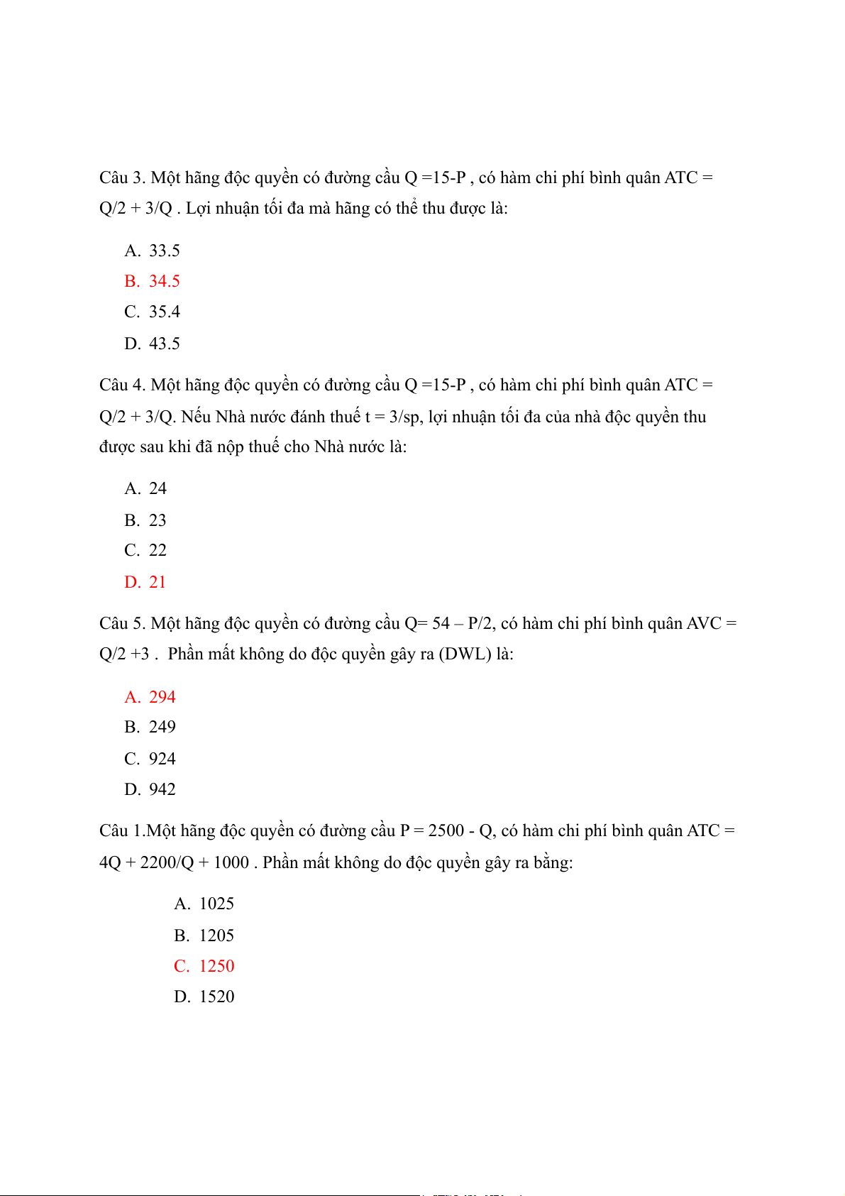 4Q + 2200/Q + 1000 . Phần mất không do độc quyền gây ra bằng: A. 1025 B. 1205 C. 1250 D. 1520