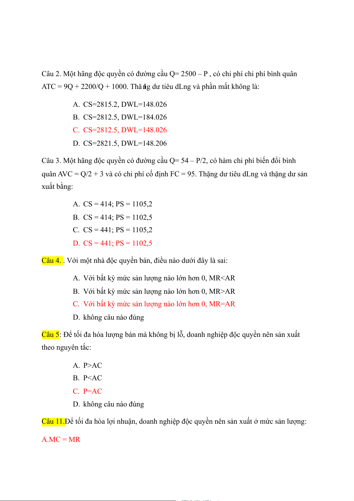 Câu 11.Để tối đa hóa lợi nhuận, doanh nghiệp độc quyền nên sản xuất ở mức sản lượng: A.MC = MR B.MC > MR C.MC < MR D.không câu nào đúng