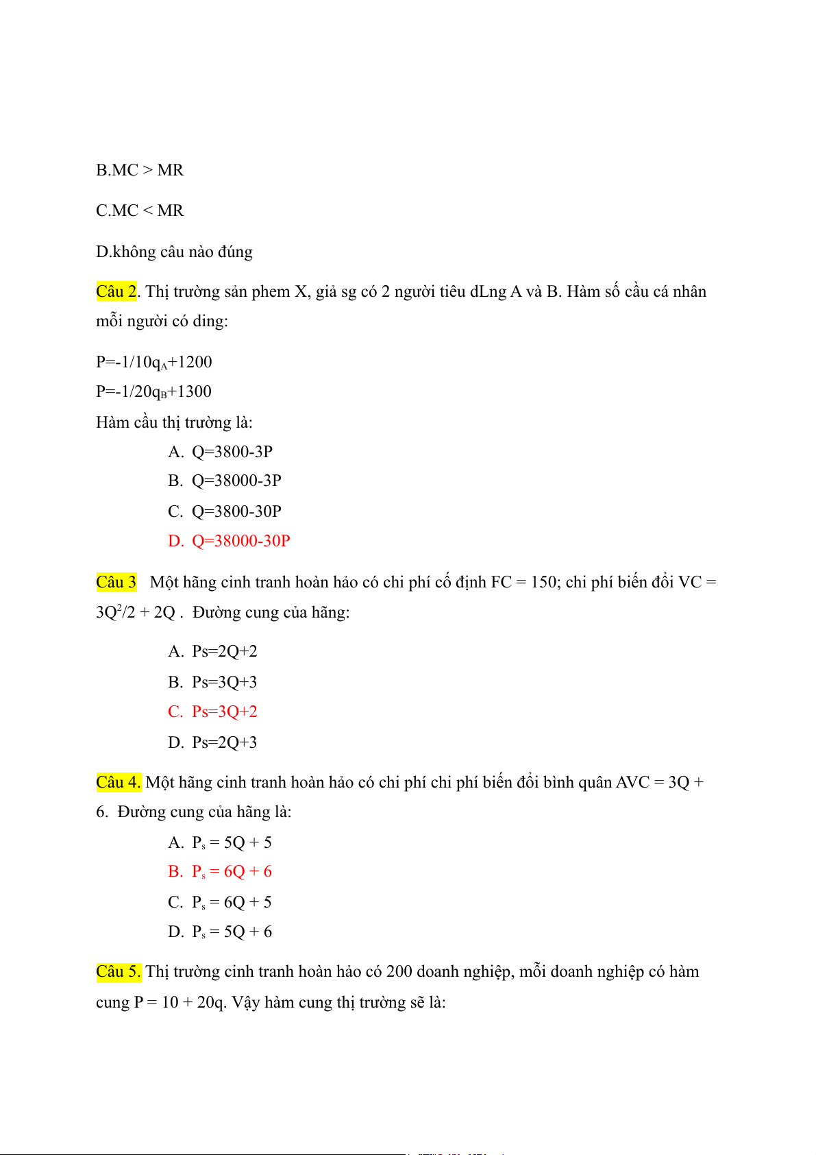 Câu 5. Thị trường cinh tranh hoàn hảo có 200 doanh nghiệp, mỗi doanh nghiệp có hàm