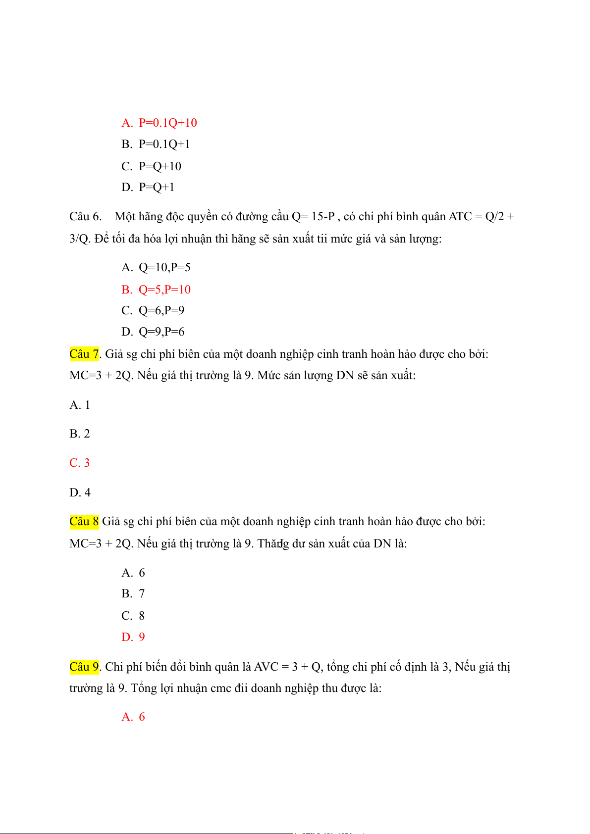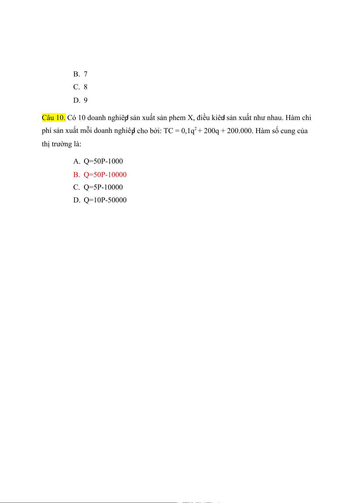 trường là 9. Tổng lợi nhuận cmc đii doanh nghiệp thu được là: A. 6 B. 7 C. 8 D. 9 Câu 10. Có 10 doanh nghiê J