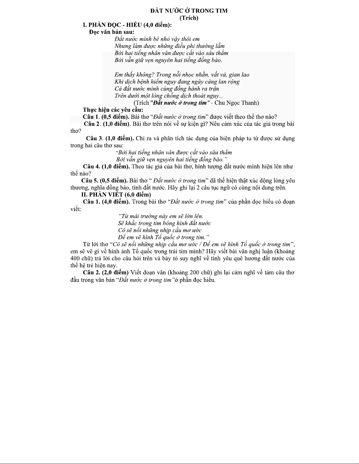 Đề Thi Giữa Kỳ Môn Ngữ Văn: Đất Nước Trong Tim (THƯC 123)