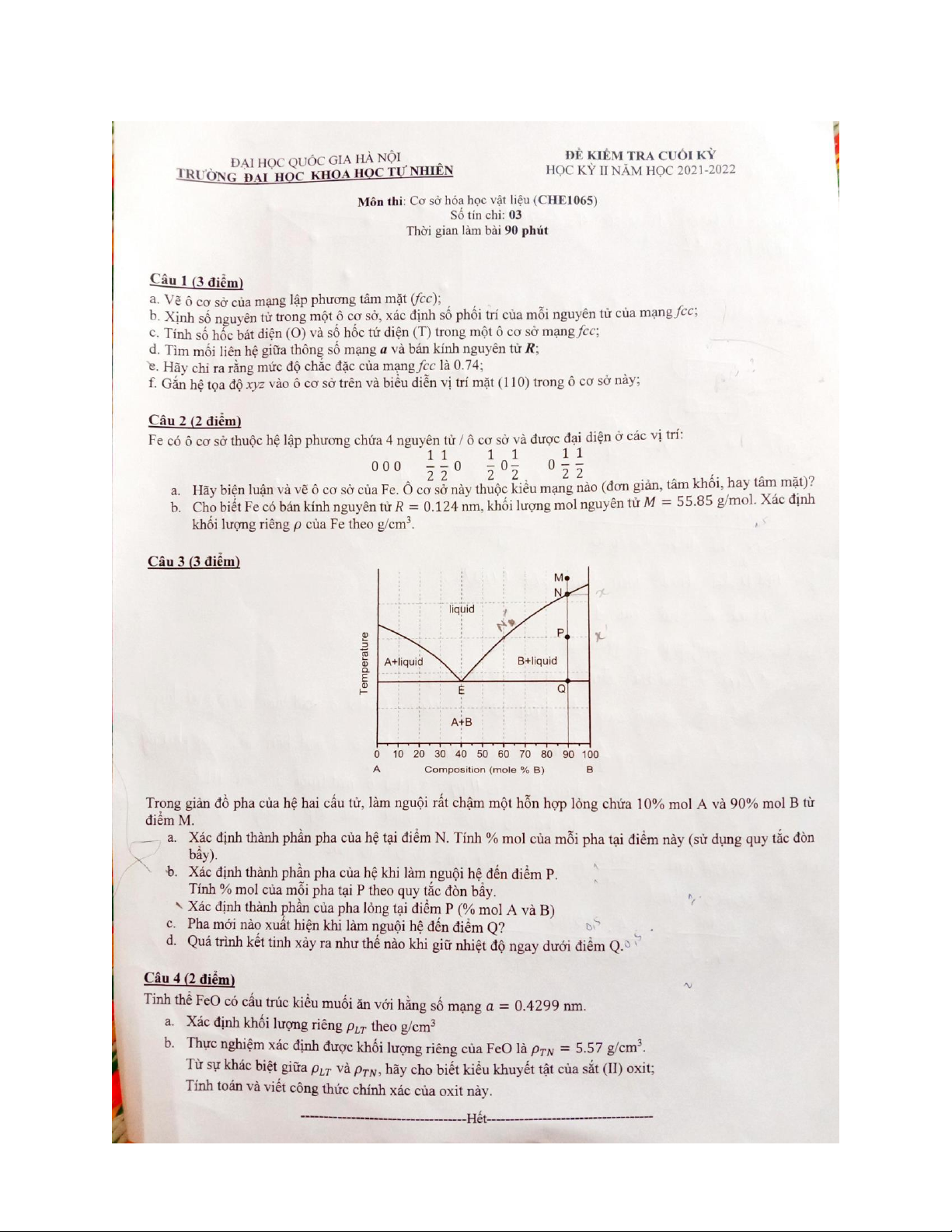 Đề thi hết môn học kì 1 Cơ sở hóa học vật liệu năm học 2025-2026 - trường đại học Khoa học tự nhiên – Đại học quốc gia hà nội
