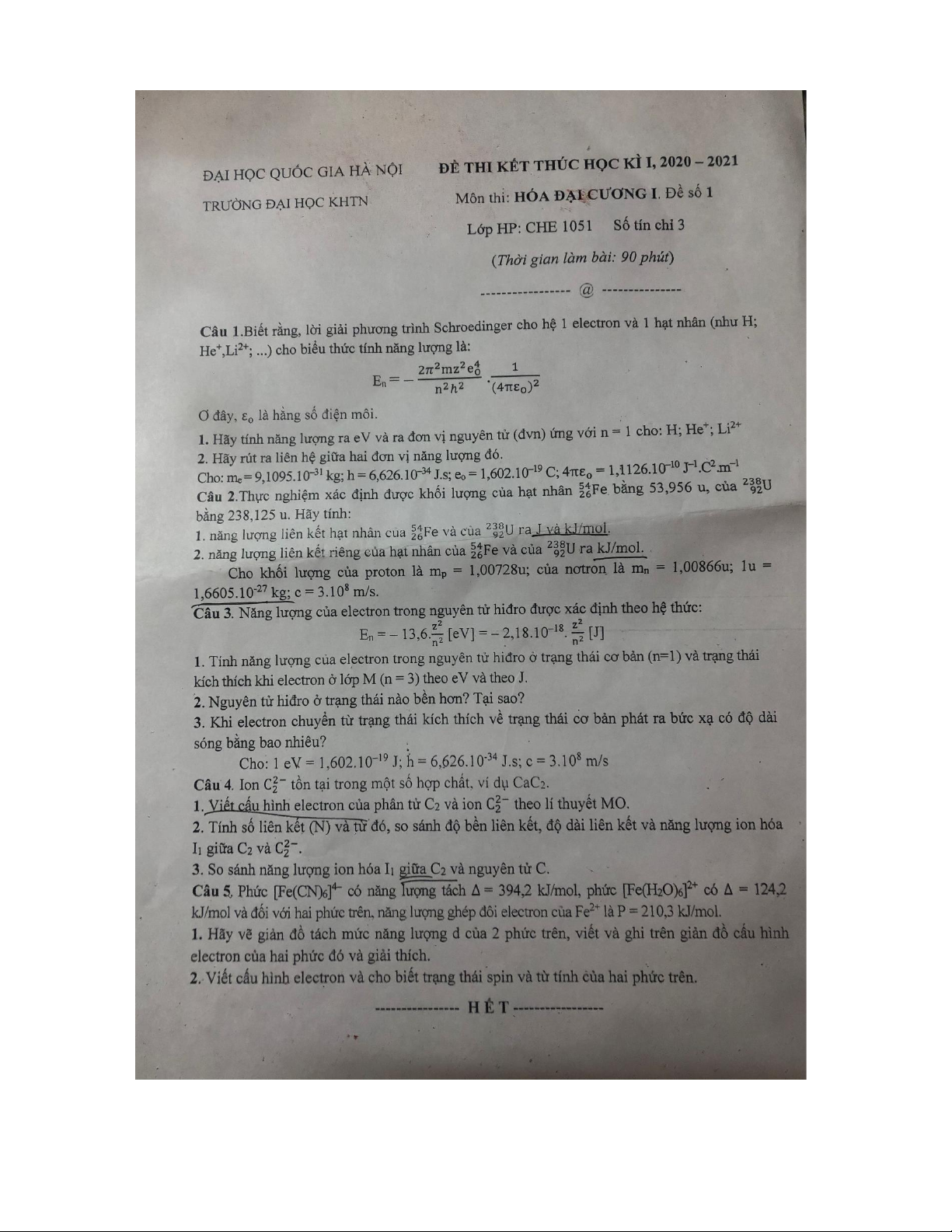 Đề thi hết môn học kì 1 Hóa đại cương năm học 2025-2026 - trường đại học Khoa học tự nhiên – Đại học quốc gia hà nội.