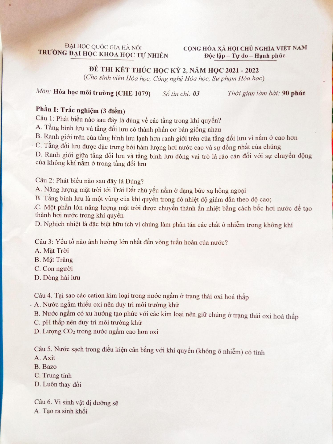 Đề thi hết môn học kì 1 Hóa môi trường năm học 2025-2026 - trường đại học Khoa học tự nhiên – Đại học quốc gia hà nội.