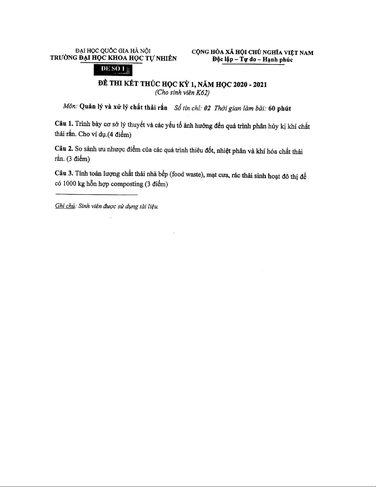 Đề thi hết môn học kì 1 Quản lý và xử lý chất thải rắn năm học 2025-2026 - trường đại học Khoa học tự nhiên – Đại học quốc gia hà nội.