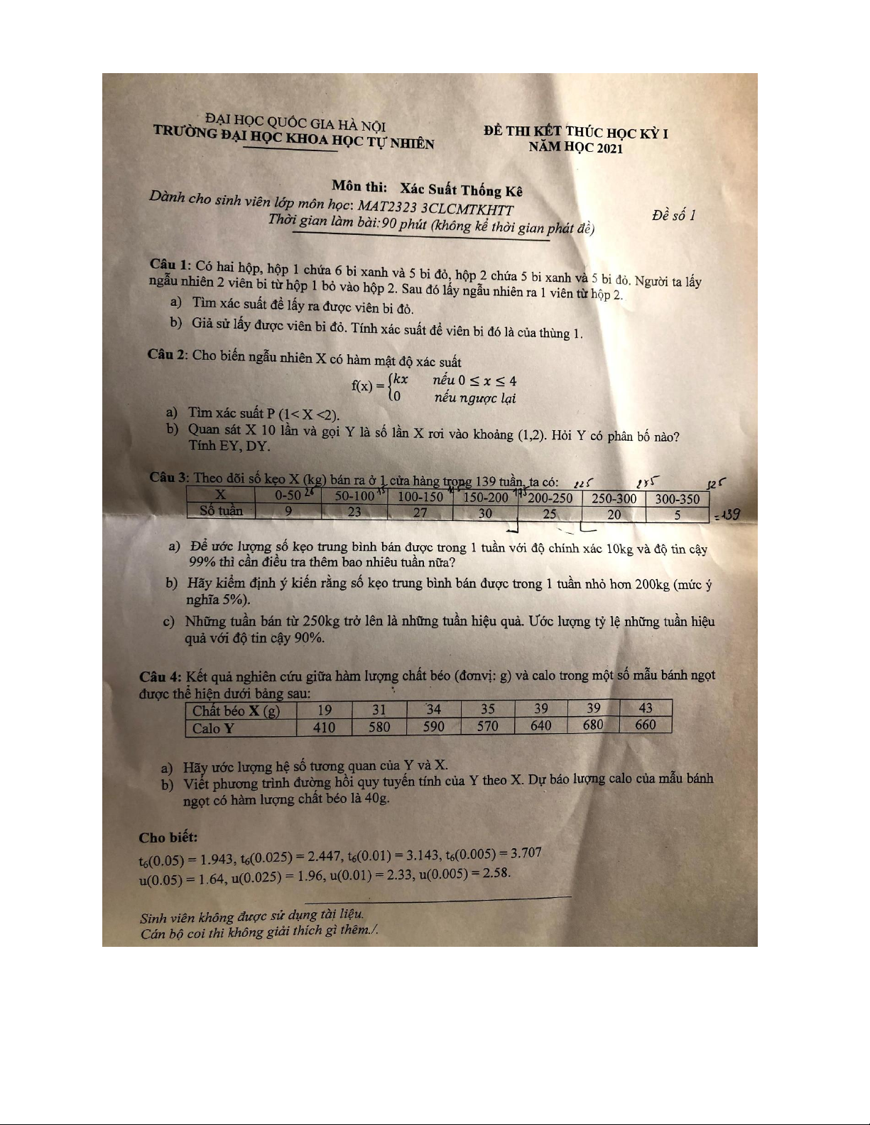 Đề thi hết môn học kì 1 Xác suất thống kê học năm học 2025-2026 - trường đại học Khoa học tự nhiên – Đại học quốc gia hà nội.