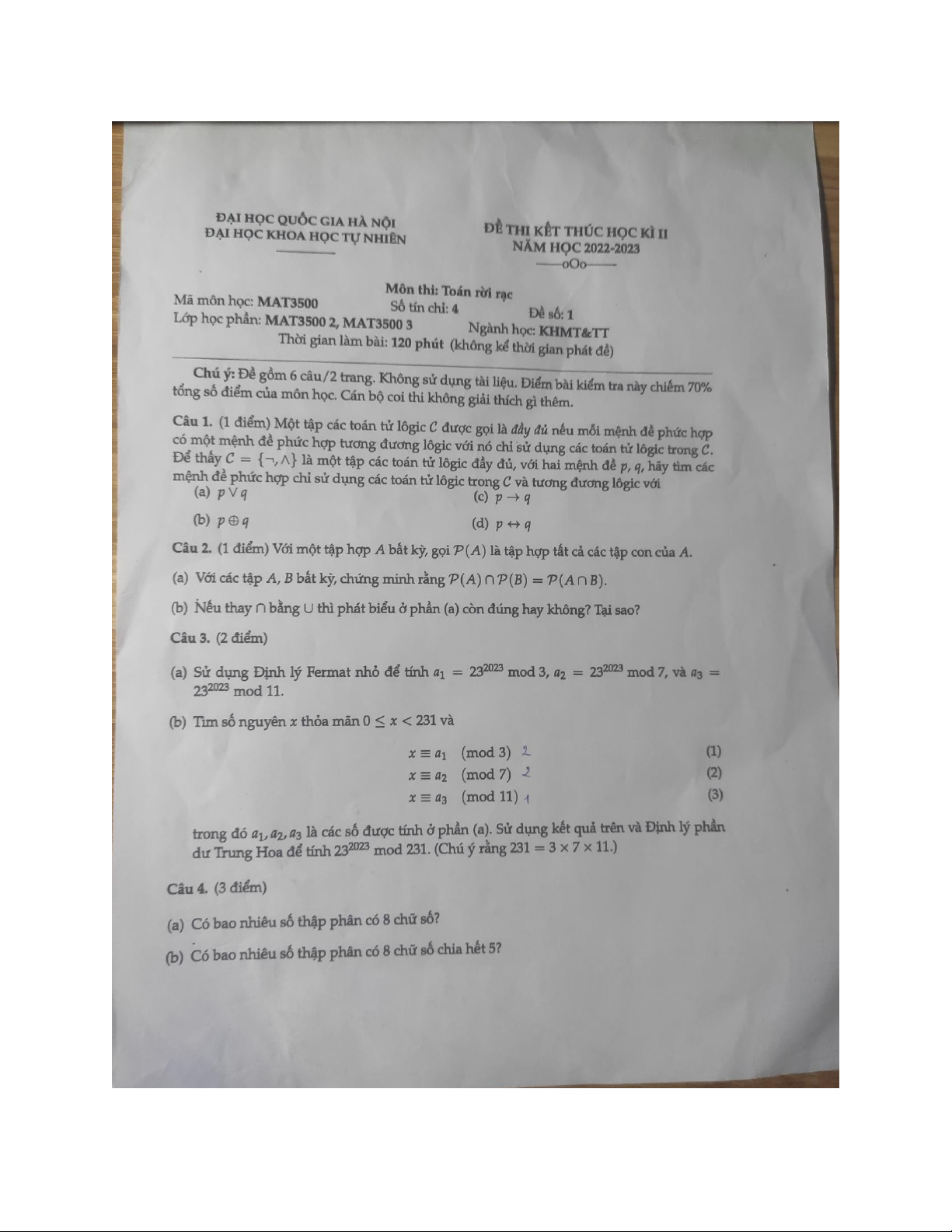 Đề thi hết môn học kì Toán rời rạc năm học 2025-2026 - trường đại học Khoa học tự nhiên – Đại học quốc gia hà nội.