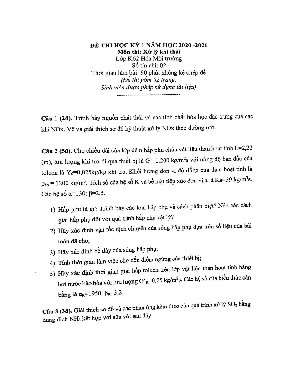 Đề thi hết môn học kì Xử lý khí thải năm học 2025-2026 - trường đại học Khoa học tự nhiên – Đại học quốc gia hà nội