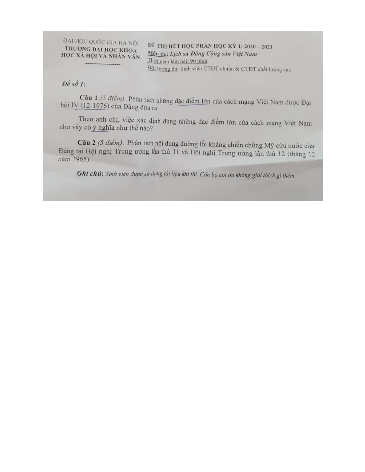 Đề thi cuối kì 1 môn Đảng cộng sản Việt nam năm học 2025-2026 - trường đại học Khoa học xã hội và nhân văn - Đại học Quốc Gia Hà nội.