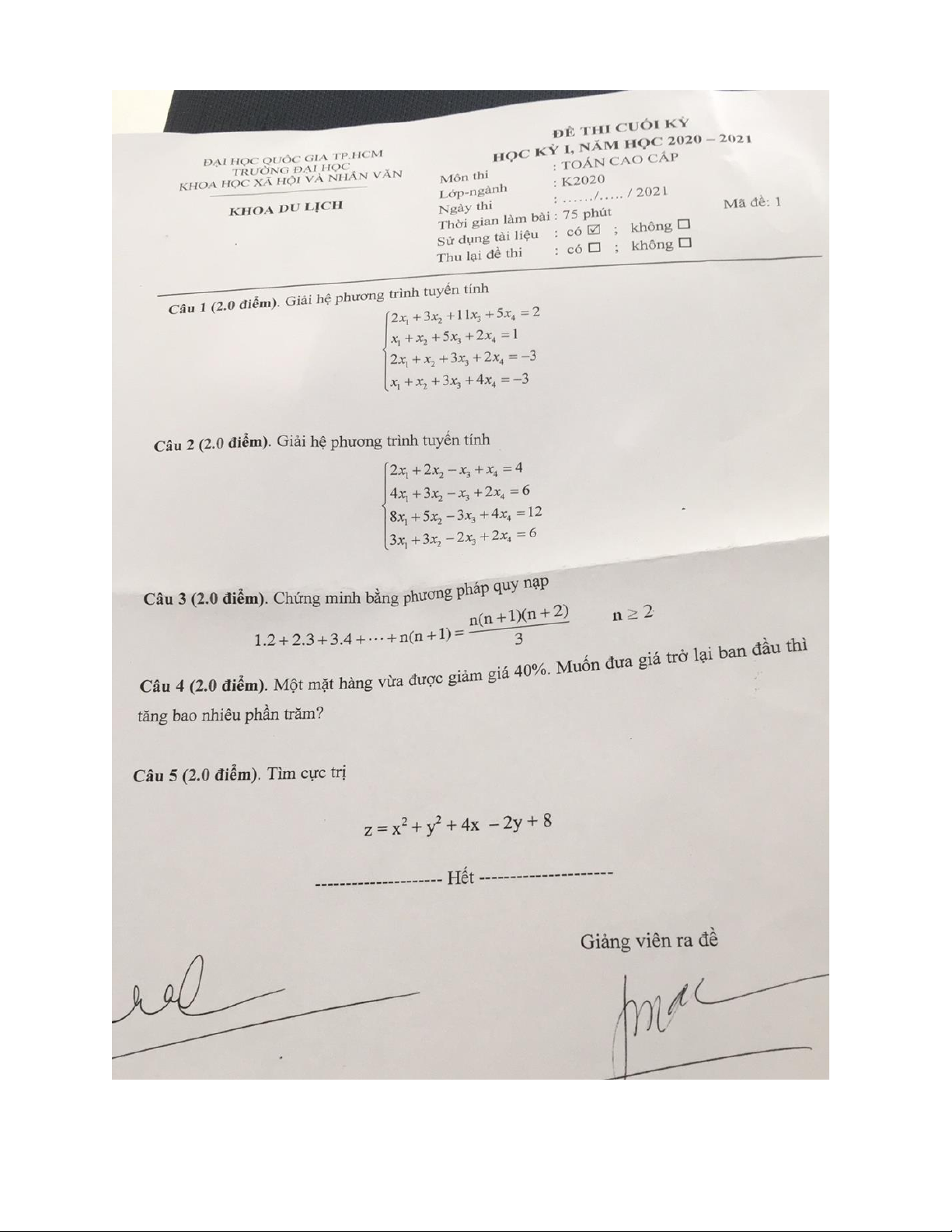 Đề thi hết môn Toán cao cấp năm học 2025-2026 - trường đại học Khoa học xã hội và nhân văn – Đại học quốc gia Thành phố hồ chí minh