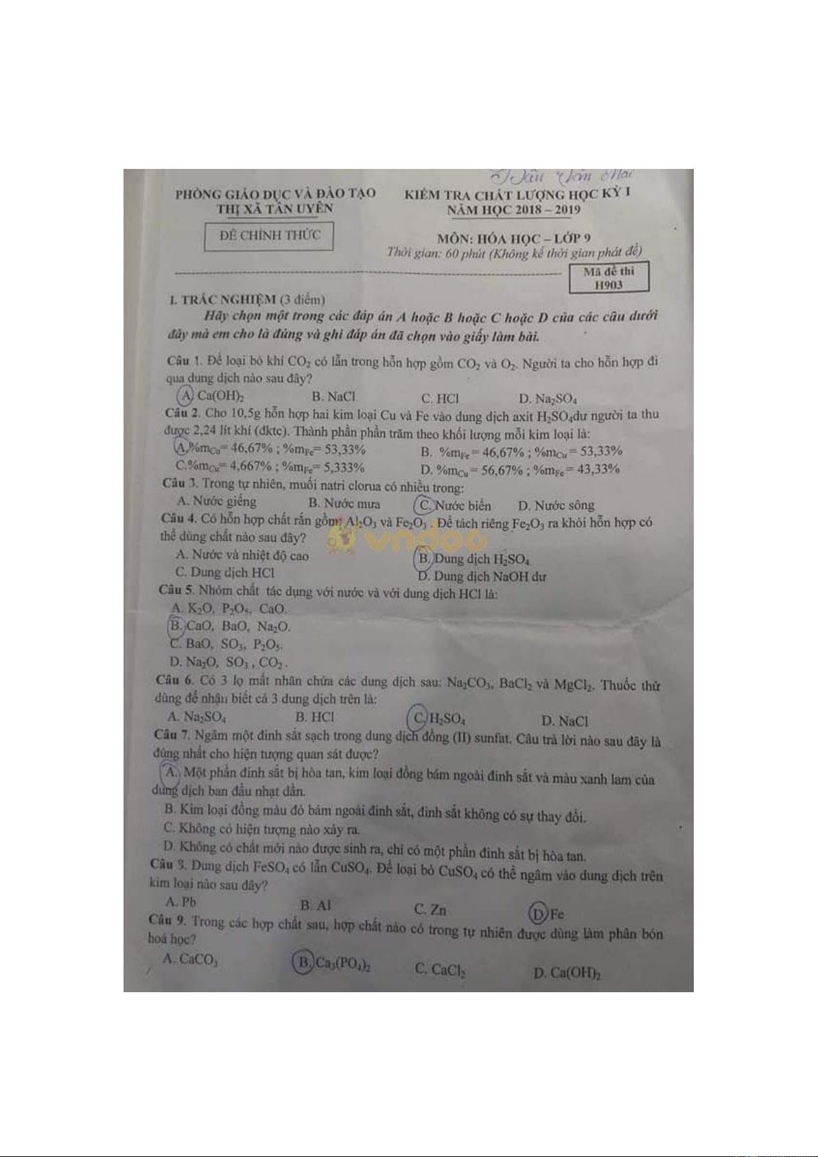 Đề thi học kì 1 lớp 9 môn Hóa học Phòng GD&ĐT thị xã Tân Uyên năm học 2018 - 2019