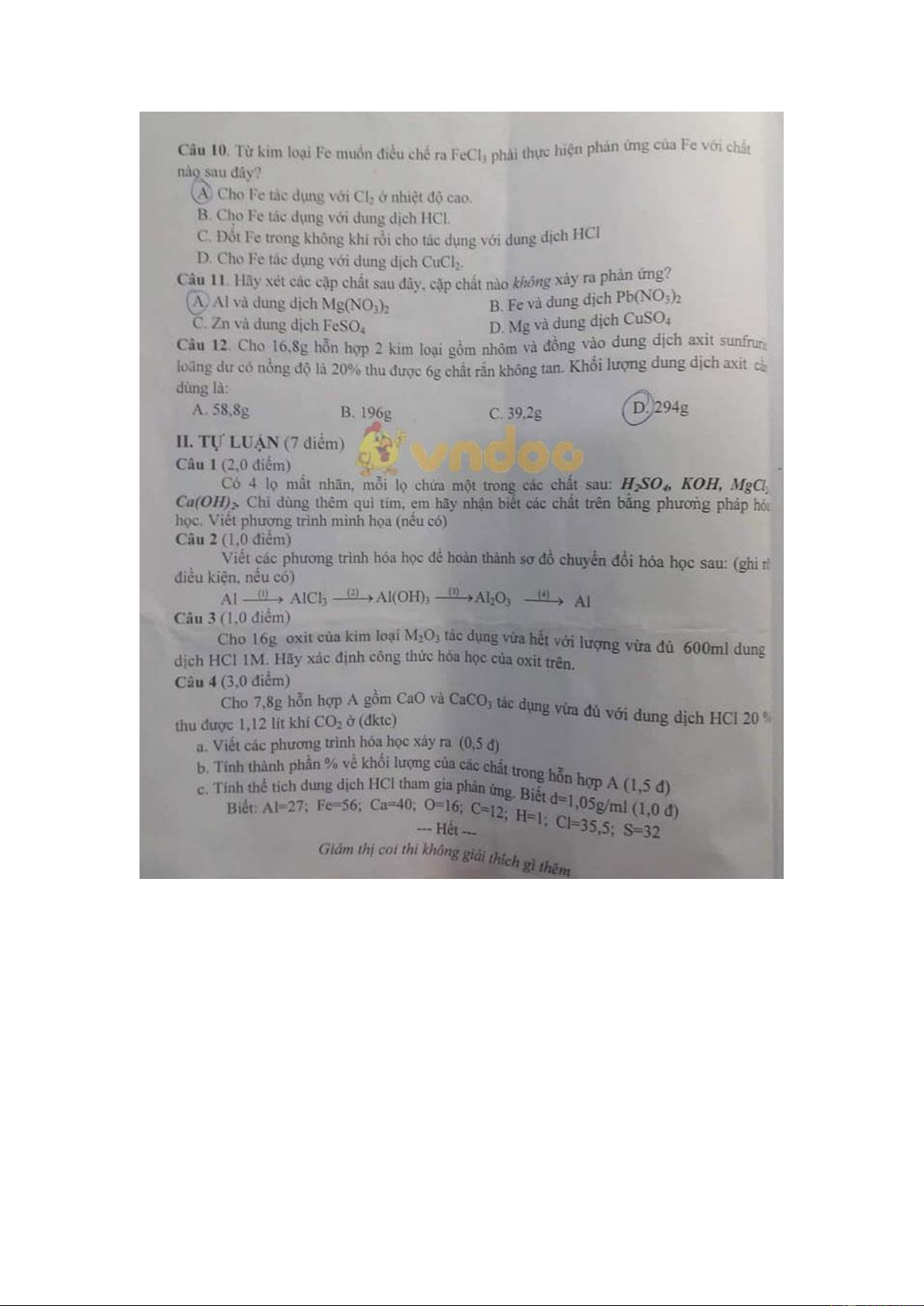 Đề thi học kì 1 lớp 9 môn Hóa học Phòng GD&ĐT quận Thủ Đức