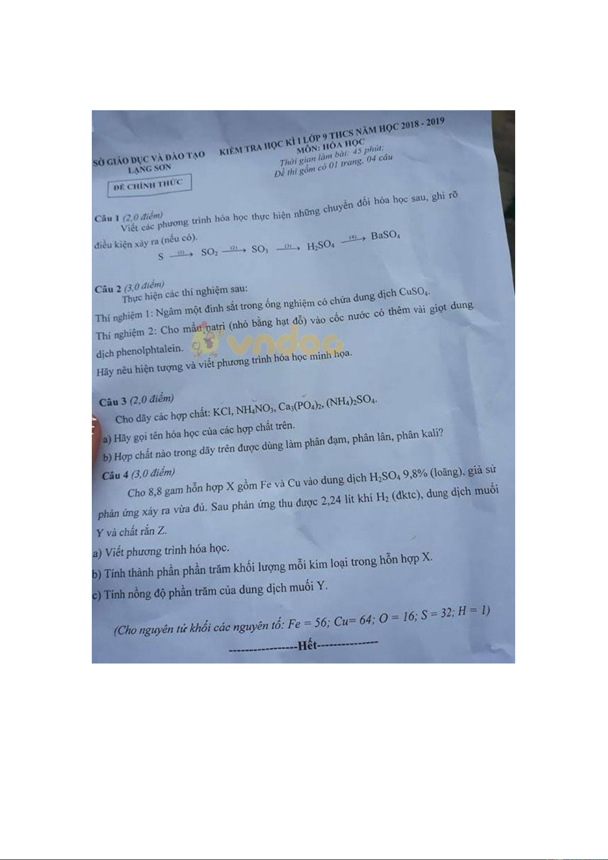 Đề thi học kì 1 lớp 9 môn Hóa học Sở GD&ĐT Lạng Sơn năm học 2018 - 2019