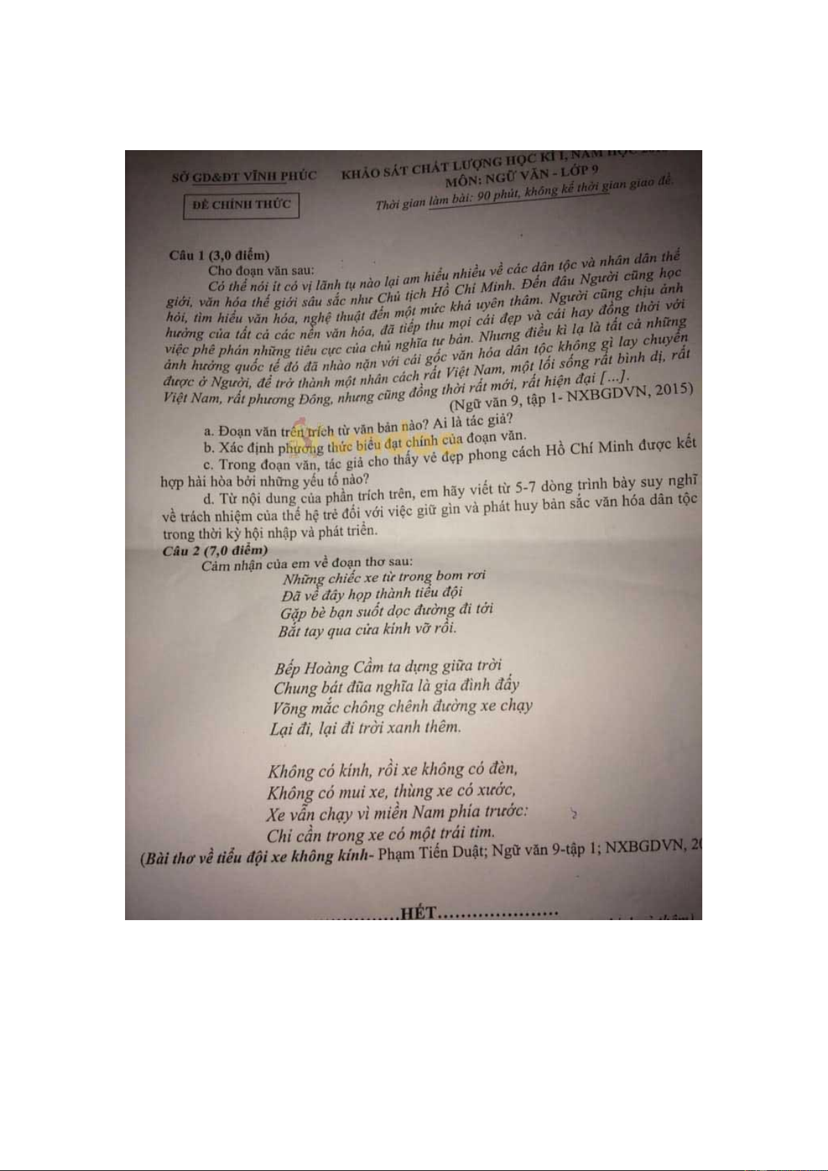 Đề thi học kì 1 lớp 9 môn Ngữ văn Sở GD&ĐT Vĩnh Phúc năm học 2018 - 2019