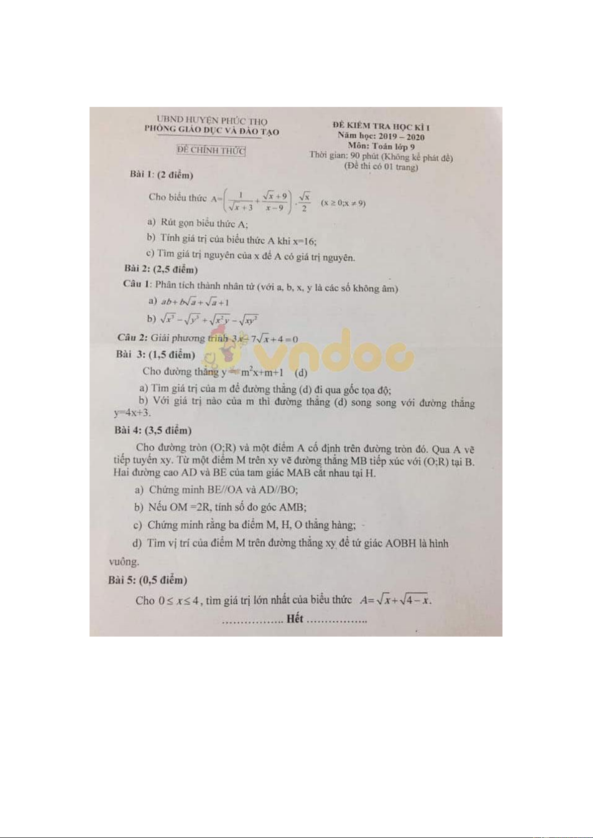 Đề thi học kì 1 lớp 9 môn Toán Phòng GD&ĐT huyện Phúc Thọ năm học 2019 - 2020