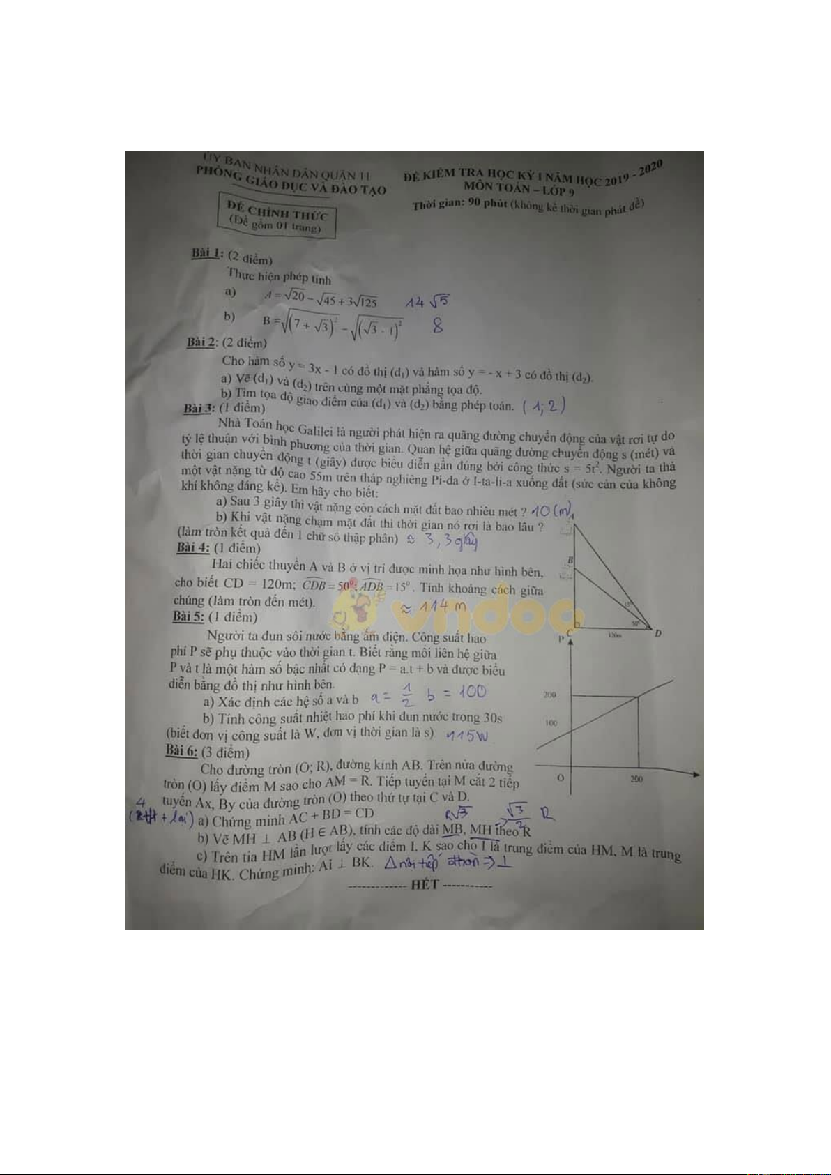 Đề thi học kì 1 lớp 9 môn Toán Phòng GD&ĐT Quận 11 năm học 2019 - 2020
