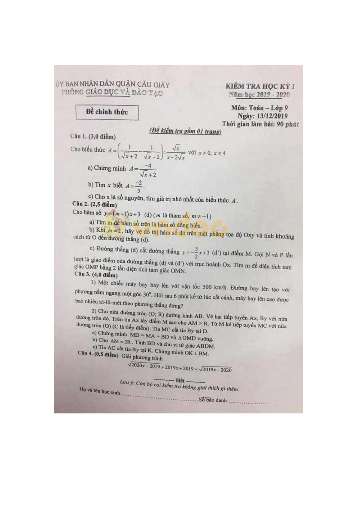 Đề thi học kì 1 lớp 9 môn Toán Phòng GD&ĐT quận Cầu Giấy năm học 2019 - 2020
